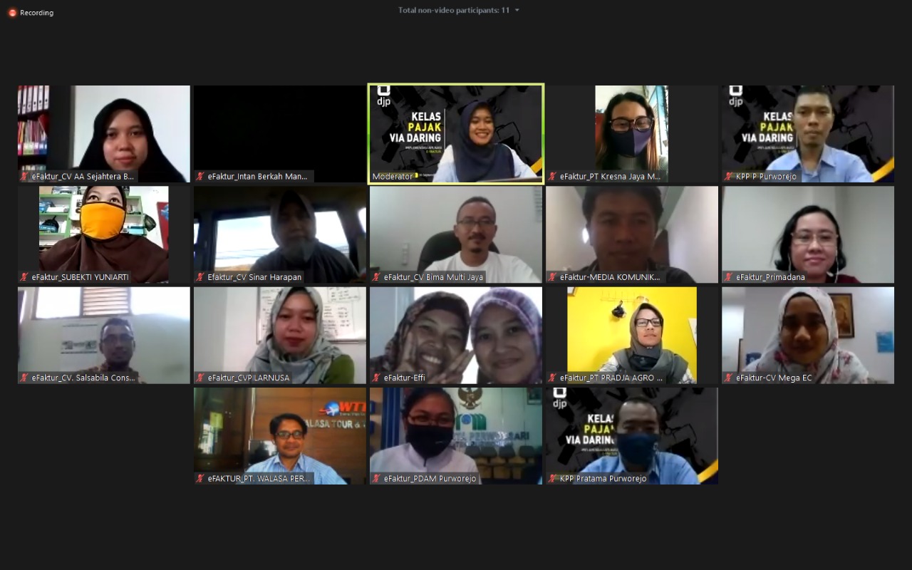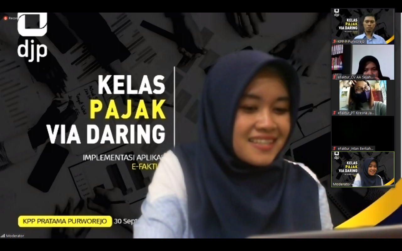 Kantor Pelayanan Pajak (KPP) Pratama Purworejo mengadakan sosialisasi penerapan aplikasi elektronik faktur pajak atau e-Faktur 3.0 secara daring melalui aplikasi Zoom Cloud Meeting dari ruang rapat KPP Pratama Purworejo (Rabu, 30/9).