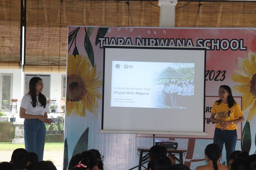 Kantor Pelayanan, Penyuluhan, dan Konsultasi Perpajakan (KP2KP) Kerobokan dan Kantor Pelayanan Pajak (KPP) Pratama Badung Utara mengenalkan pajak melalui kegiatan Tax Goes To School (TGTS) kepada siswa Sekolah Tiara Nirwana di Jl. Muding Batu Sangian IV No.7, Kerobokan Kaja, Kecamatan Kuta Utara, Kabupaten Badung, Bali (Jumat, 14/7).
