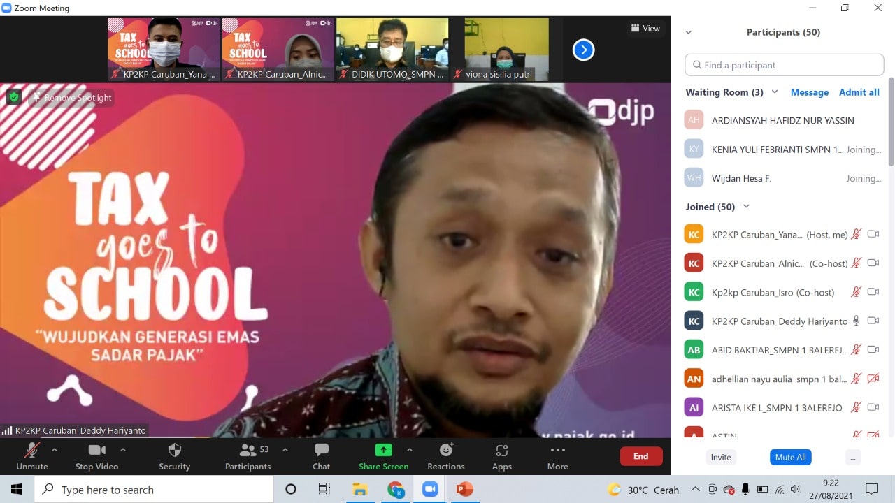 Kantor Pelayanan, Penyuluhan, dan Konsultasi Perpajakan (KP2KP) Caruban bersama Sekolah Menengah Pertama Negeri (SMPN) 1 Balerejo mengadakan acara Tax Goes To School (TGTS) 2021 di KP2KP Caruban (Jumat, 27/8). Dengan mengusung tema "Bersama Wujudkan Generasi Emas Sadar Pajak”, acara diikuti oleh 47 siswa-siswi SMPN 1 Balerejo secara daring melalui aplikasi Zoom Meeting.