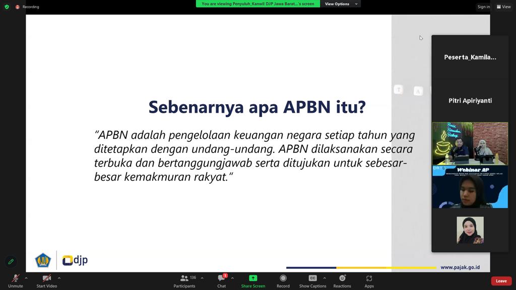Penyuluh Pajak Kanwil DJP Jawa Barat I Adhitia Mulyadi dan Dwi Wahyuningsih menjadi narasumber dalam Webinar dengan  tema Mengungkap Peran dan Fungsi Dasar APBN yang diselenggarakan oleh Tax Center Universitas Muhammadiyah Bandung (UMB) secara daring melalui Zoom Meeting di Kota Bandung (Rabu, 6/9). Acara yang diikuti oleh 136 mahasiswa serta  dosen Universitas Muhammadiyah Bandung ini dimulai pukul 09.00 WIB hingga 11.30 WIB, dan turut dihadiri juga oleh  Kepala Program Studi Administrasi Publik UMB Meti Mediyastuti.