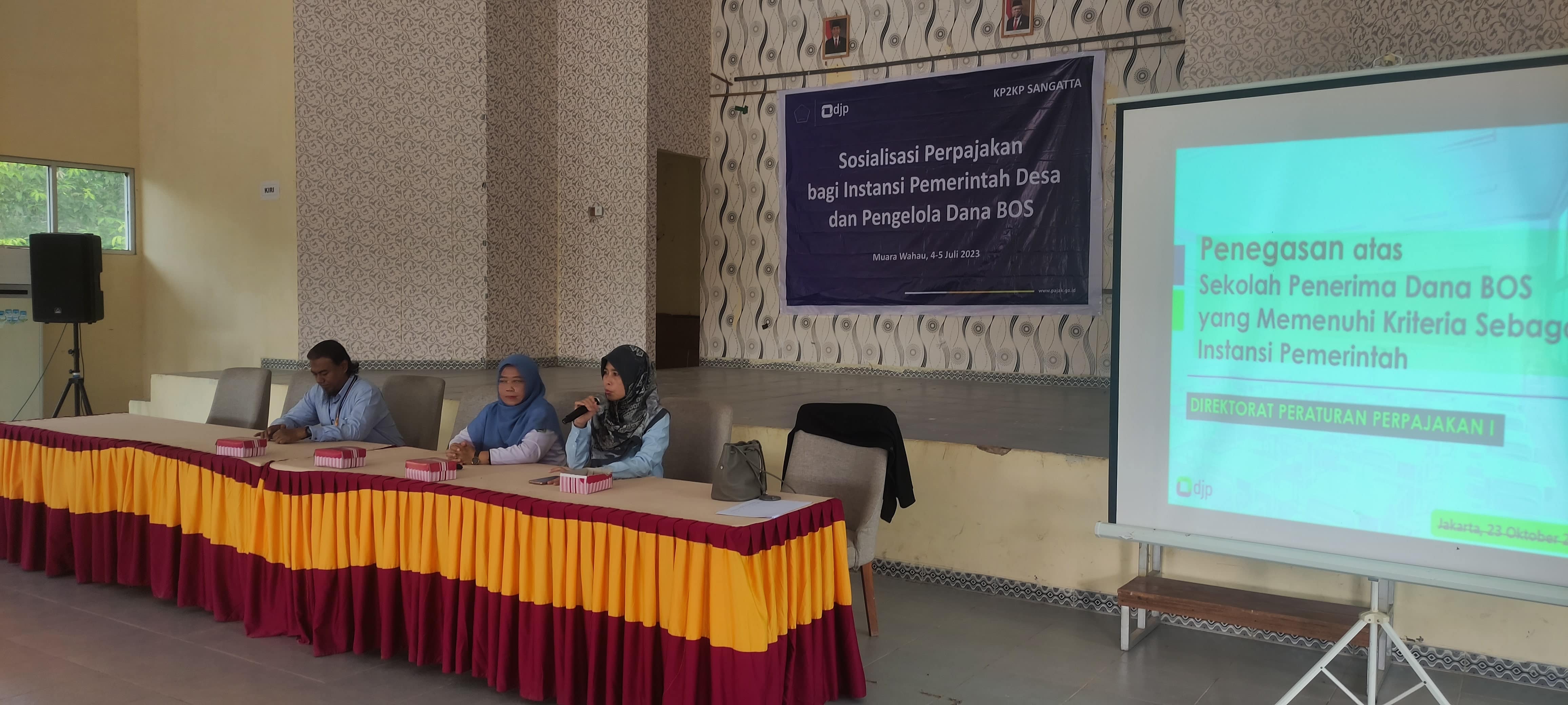 Kantor Pelayanan, Penyuluhan, dan Konsultasi Perpajakan (KP2KP) Sangatta berkolaborasi dengan Kantor Pelayanan Pajak (KPP) Pratama Bontang dalam menyelenggarakan Sosialisasi Kewajiban Perpajakan Bendahara Sekolah Pemegang BOS di wilayah Kecamatan Wahau dengan narasumber Penyuluh Pajak KPP Pratama Bontang Nanang Maulana di Aula Kantor Kecamatan Muara Wahau, Kabupaten Kutai Timur (Rabu, 5/7).