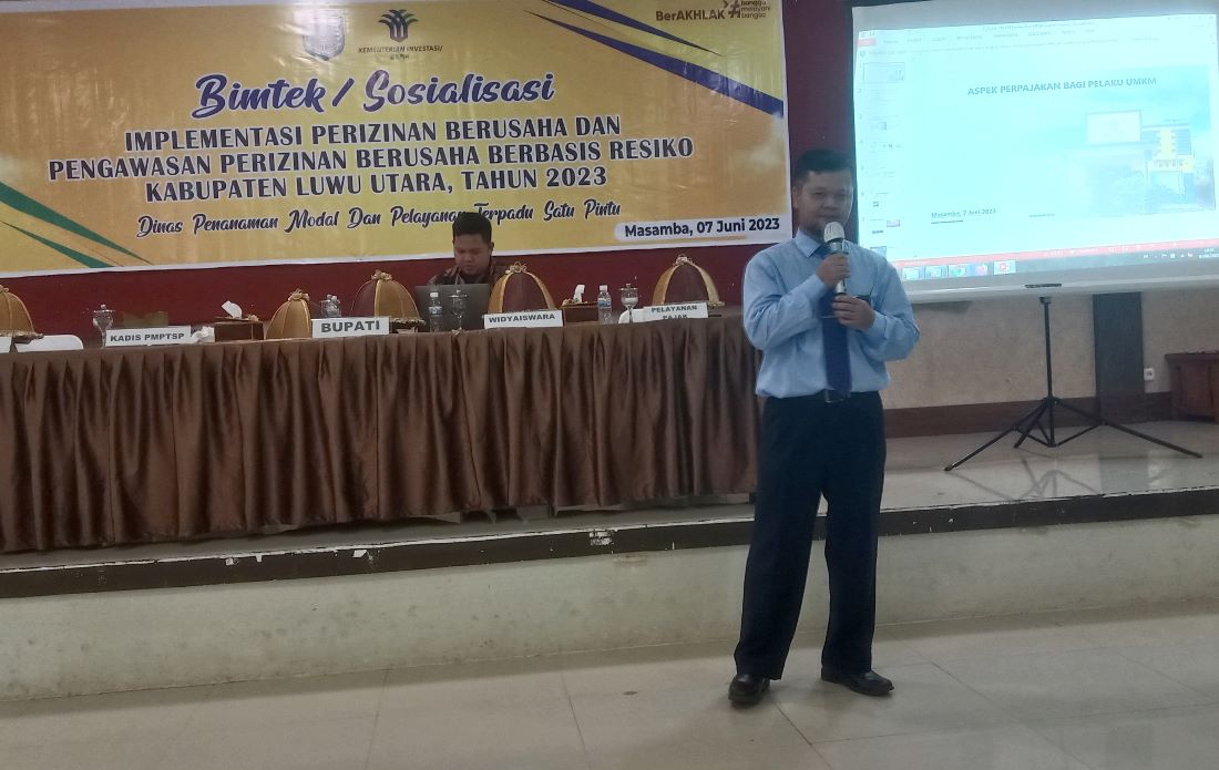 Kantor Pelayanan, Penyuluhan, dan Konsultasi Perpajakan (KP2KP) Masamba berkolaborasi dengan Dinas Penanaman Modal dan Pelayanan Terpadu Satu Pintu (DPMPTSP) Kabupaten Luwu Utara dalam acara Sosialisasi Implementasi Perizinan Usaha Bagi Pelaku Usaha Mikro, Kecil dan Menengah (UMKM) di wilayah Luwu Utara pada hari (Rabu, 7/6). Acara sosialisasi tersebut diselenggarakan di Aula Kantor Bupati Luwu Utara yang terletak di Kecamatan Masamba.