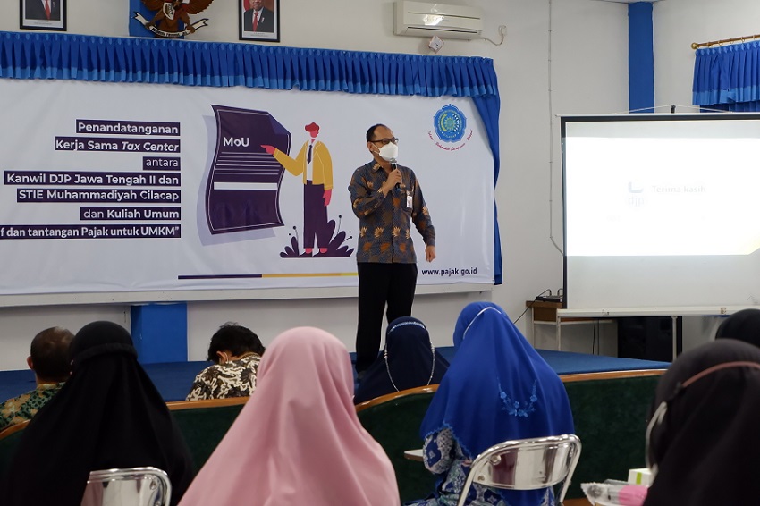 Mohamad Teguh Prasetyo, Kepala Kantor Pelayanan Pajak Pratama Cilacap memberikan edukasi perpajakan kepada mahasiswa STIE Muhammadiyah Cilacap (Selasa, 16/11). Edukasi ini disampaikan dalam acara Penandatangan Kerja Sama Tax Center antara Kanwil DJP Jawa Tengah II dengan STIE Muhamaddiyah Cilacap dan Kuliah Umum Insentif dan Tantangan Pajak untuk UMKM yang diadakan secara langsung di Aula STIE.