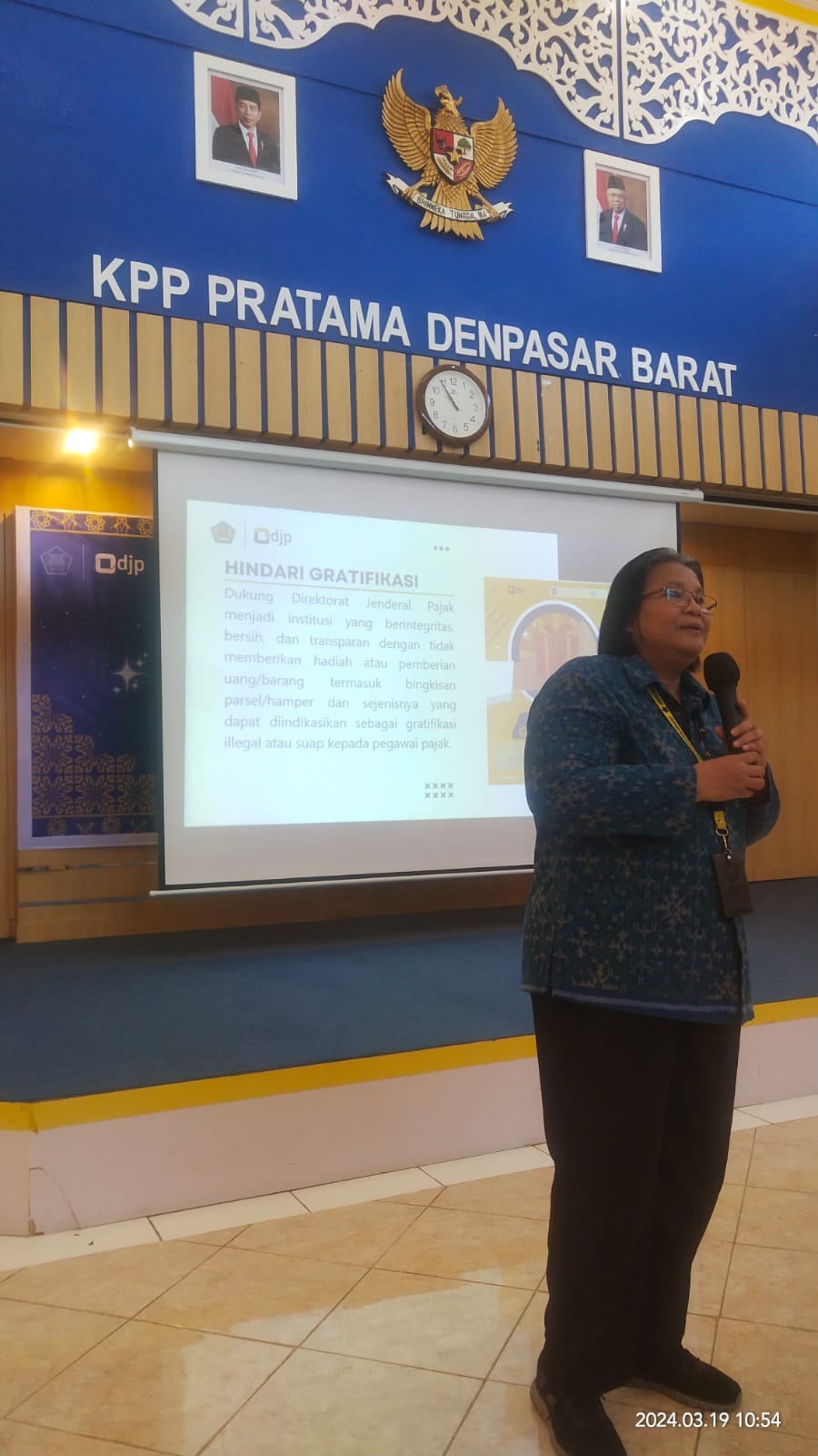 “Dukung Direktorat Jenderal Pajak menjadi institusi yang berintegritas, bersih, dan transparan dengan tidak memberikan hadiah atau pemberian uang/barang termasuk bingkisan parsel/hamper dan sejenisnya yang dapat diindikasikan sebagai gratifikasi illegal atau suap kepada pegawai pajak,” kata Nyoman Ayu Ningsih Kepala Kantor Pelayanan Pajak Denpasar Barat saat acara pemberian penghargaan di Aula KPP Pratama Denpasar Barat (Selasa, 19/3).