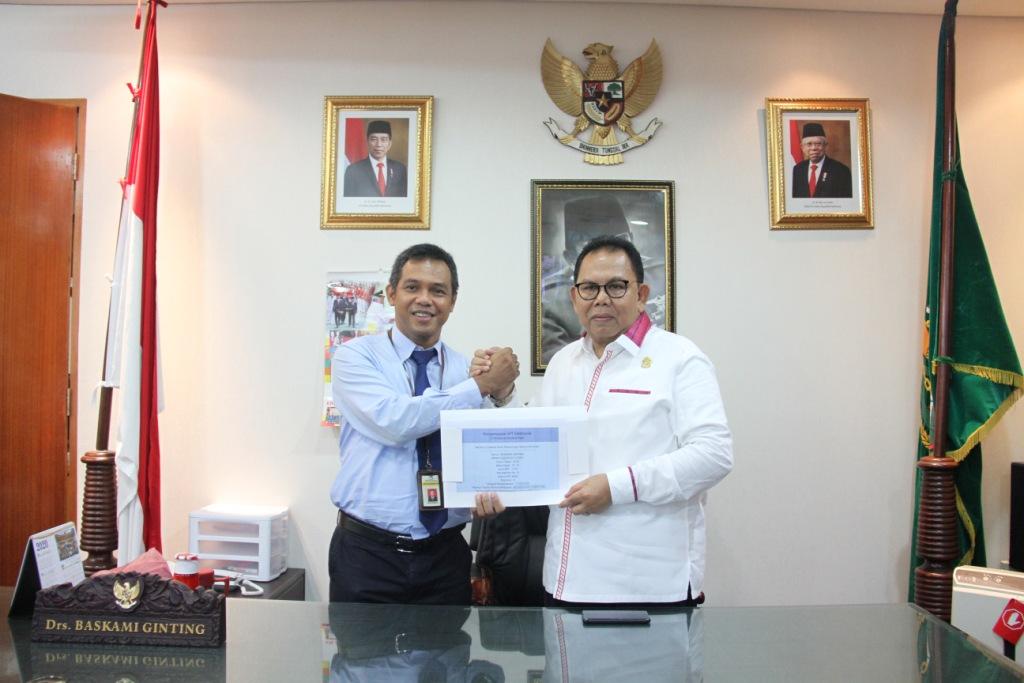 Ketua DPRD Sumatera Utara (SU) Drs. Baskami Ginting menyampaikan laporan SPT Tahunan di ruang kerjanya di Medan (Rabu, 19/2). SPT disampaikan melalui e-Filing. Bukti Penerimaan Elektronik (BPE) SPT dikirimkan melalui email dan disampaikan secara simbolis oleh Plt. Kepala Kantor Wilayah (Kanwil) Direktorat Jenderal Pajak (DJP) Sumut I Max Darmawan. Ketua DPRD-SU didampingi oleh Wakil Ketua DPRD-SU Harun Mustafa Nasution, Wakil Ketua DPRD-SU H. Salman Alfarisi, LC. MA, dan Anggota DPRD-SU Artha Berliana Samosir.