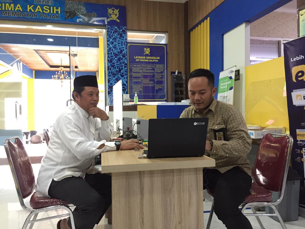Jelang bulan suci Ramadhan tahun 2023, KH. Dr. Agus Ahmad Suaidi, Lc MA, Ketua Majelis Ulama Indonesia (MUI) Kota Salatiga mendatangi Kantor Pelayanan Pajak (KPP) Pratama Salatiga untuk melakukan konsultasi dan memenuhi kewajiban perpajakan di Ruang Tunggu Tempat Pelayanan Terpadu (TPT) KPP Pratama Salatiga (Kamis, 16/3)