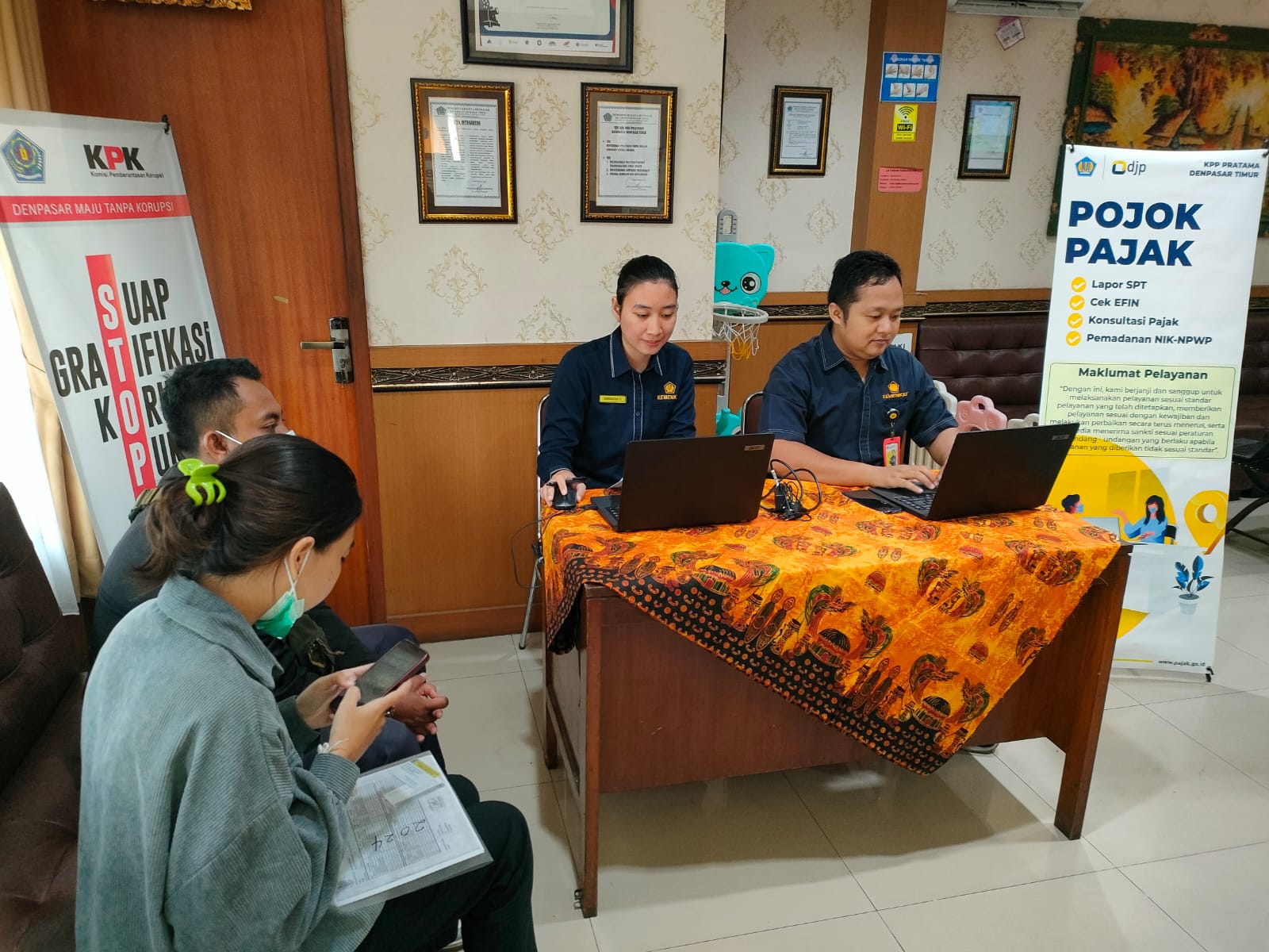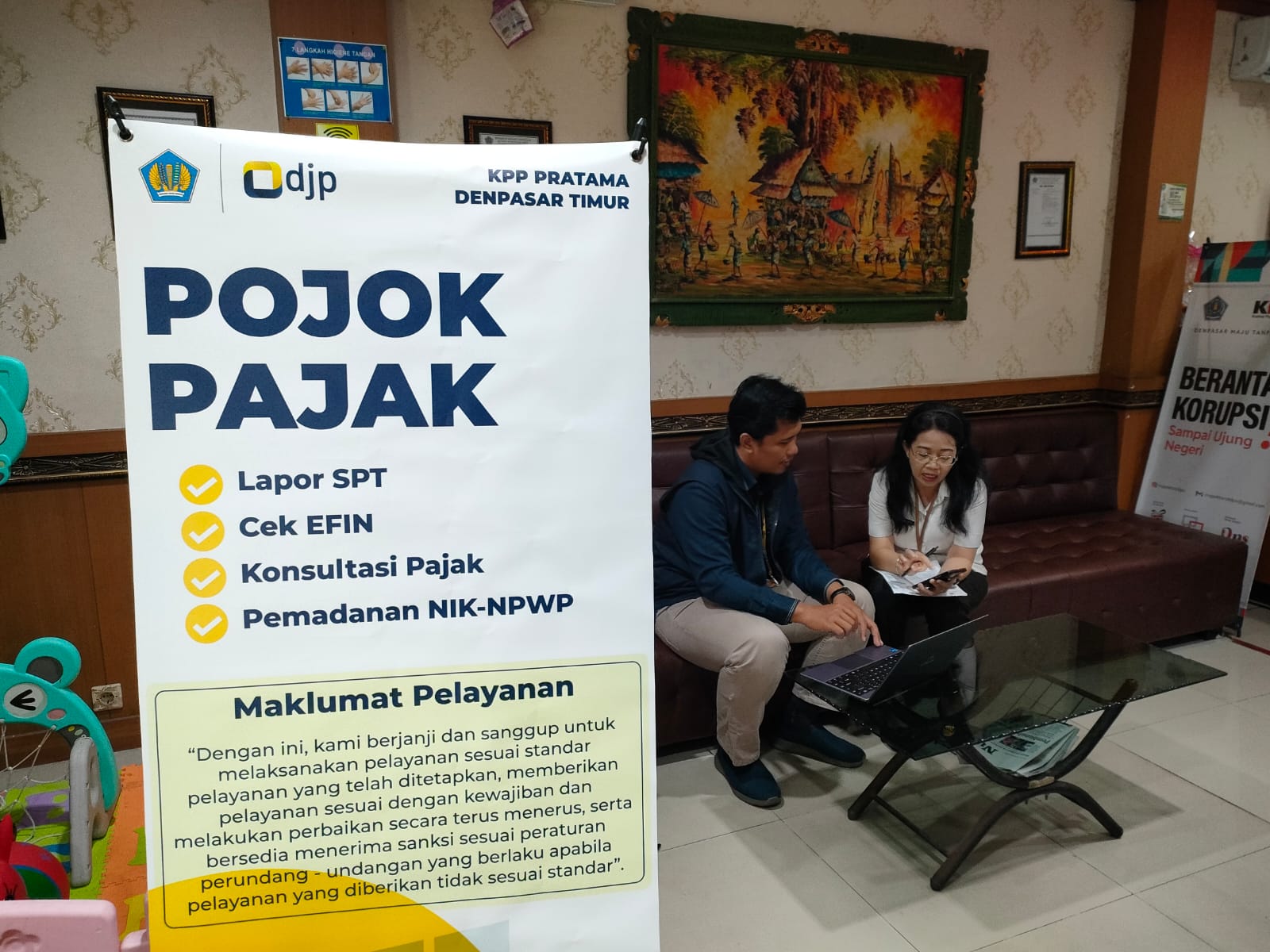 Pojok Pajak yang berlangsung dari pukul 09.00 hingga 12.00 WITA memberikan berbagai layanan yang memudahkan wajib pajak dalam memenuhi kewajiban perpajakan. Tak hanya asistensi pelaporan SPT Tahunan secara daring, Pojok Pajak juga menyediakan layanan aktivasi dan permintaan kembali Electronic Filing Identification Number (EFIN). Wajib pajak dapat memanfaatkan layanan pemadanan data Nomor Induk Kependudukan (NIK) dengan NPWP serta mendapatkan konsultasi perpajakan secara langsung dari tim KPP Pratama Denpasar Timur.