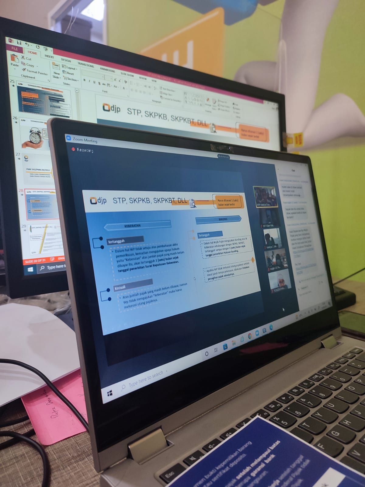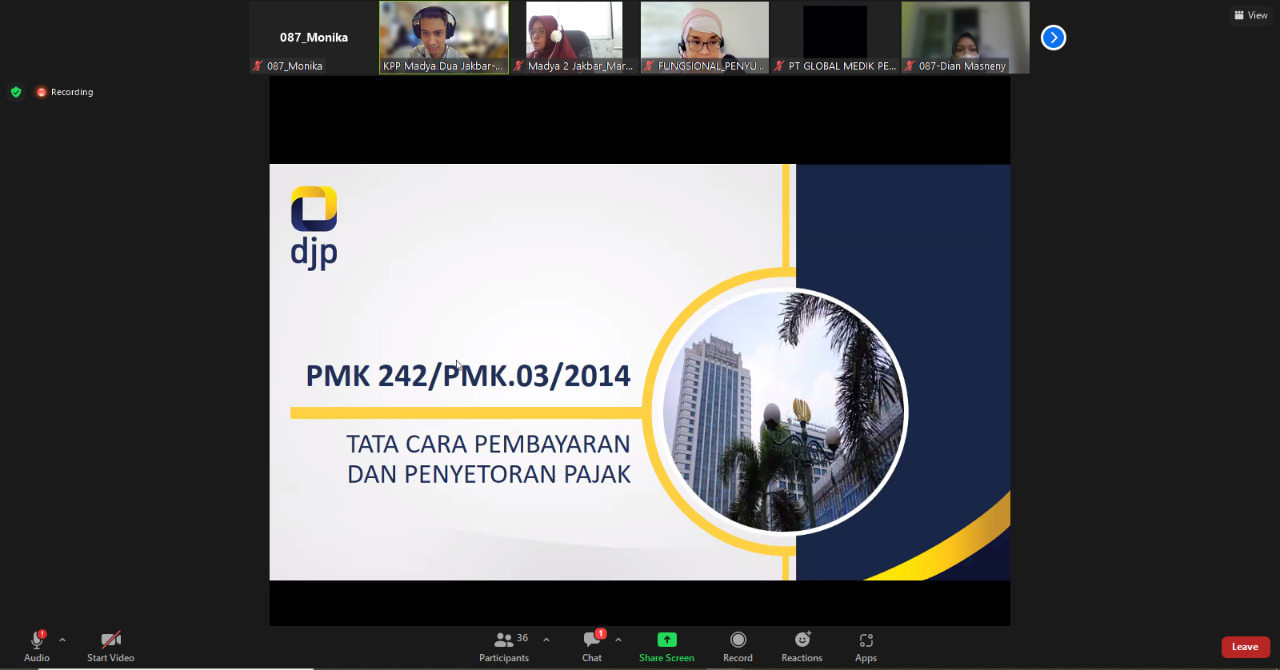Kantor Pelayanan Pajak Madya Dua Jakarta Barat mengadakan kegiatan sosialisasi perpajakan secara daring terkait PMK Nomor 189/PMK.03/2020 tentang Tata Cara Pelaksanaan Penagihan Pajak atas Jumlah Pajak yang Masih Harus Dibayar dan PMK Nomor 242/PMK.03/2020 tentang Tata Cara Pembayaran dan Penyetoran Pajak melalui Aplikasi Zoom di KPP Madya Dua Jakarta Barat (Kamis, 25/8).