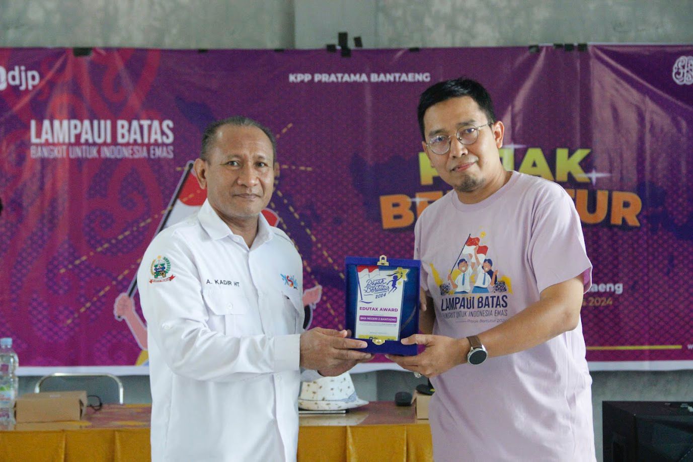 Selain itu, Kepala KPP Pratama Bantaeng juga memberikan plakat penghargaan kepada Kepala SMA Negeri 2 Bantaeng Drs. A. Kadir, HT, sebagai simbol apresiasi atas dukungan dan kerja sama dalam menyelenggarakan kegiatan Pajak Bertutur 2024. Kegiatan ditutup dengan pesan dan harapan agar siswa-siswi terus menanamkan nilai-nilai kesadaran pajak dalam kehidupan sehari-hari.