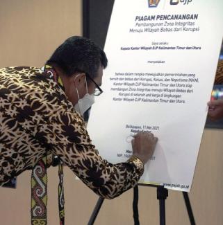 Kepala Kantor Wilayah Direktorat Jenderal Pajak Kalimantan Timur dan Utara (Kanwil DJP Kaltimtara) Max Darmawan melaksanakan pencanangan Zona Integritas Menuju Wilayah Bebas dari Korupsi (ZI-WBK) di Aula Lantai 4 Kanwil DJP Kaltimtara Jalan Ruhui Rahayu Nomor 1 Ringroad, Kota Balikpapan (Selasa, 11/5).