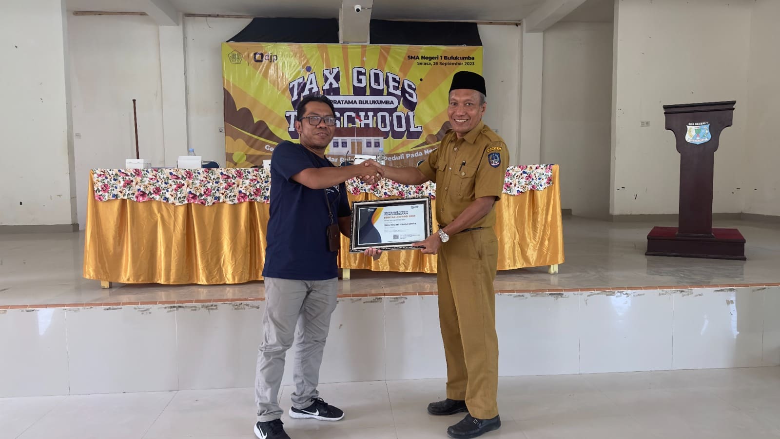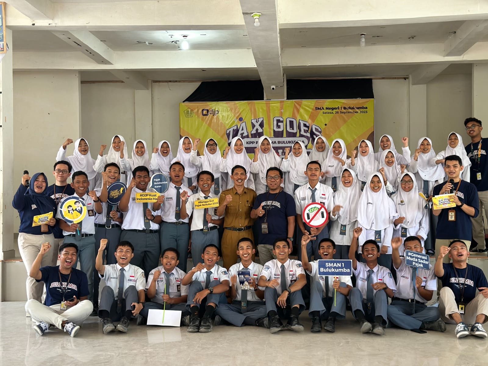 Kantor Pelayanan Pajak (KPP) Pratama Bulukumba bekerja sama dengan Sekolah Menengah Atas (SMA) Negeri 1 Bulukumba mengadakan kegiatan Tax Goes To School (TGTS) 2023 di Aula SMA Negeri 1 Bulukumba (Selasa, 26/9). Kegiatan yang mengusung tema "Sadar Pajak, Bukti Peduli Pada Negeri" ini diikuti oleh lebih dari 30 siswa-siswi SMA Negeri 1 Bulukumba.