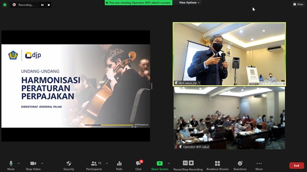 Sosialisasi dilaksanakan secara hybrid, luring di ruang rapat Whize Prime Hotel Kelapa Gading dan daring melalui Zoom Cloud Meetings diikuti 110 peserta terdiri dari pengurus dan anggota IKPI.