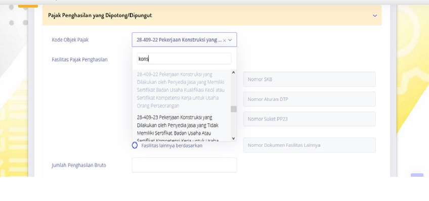 Petugas juga memandu wajib pajak dalam pemilihan kode objek pajak untuk pembuatan bukti potong pada aplikasi e-Bupot. ”Untuk kode objek pajak PPh Final jasa konstruksi, dapat Ibu pilih sesuai dengan kriteria jasa konstruksi. Adapun kode objek pajak sesuai dengan PP No 9 Tahun 2022 dimulai dari 28-402-22 sampai dengan 28-402-28,” jelas Fika