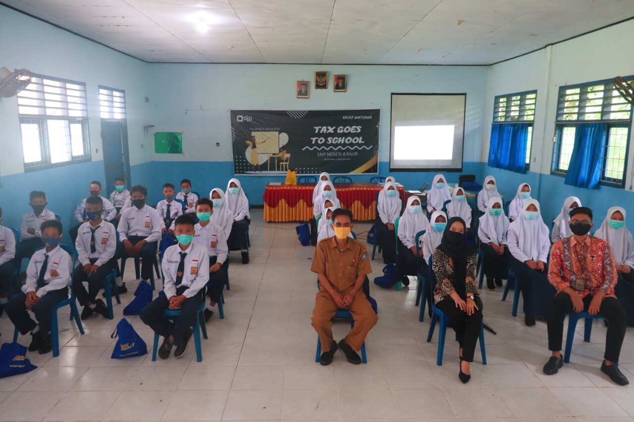 Kantor Pelayanan, Penyuluhan, dan Konsultasi Perpajakan (KP2KP) Bintuhan mengedukasi perpajakan kepada genereasi muda melalui acara Tax Goes to School (TGTS) (Selasa, 12/1). 35 orang siswa dan wakil kesiswaan dari SMP Negeri 8 Kaur hadir di aula SMP Negeri 8 Kaur yang beralamat di Kecamatan Tetap Kabupaten Kaur, Bengkulu.