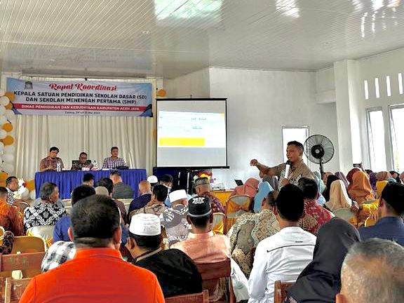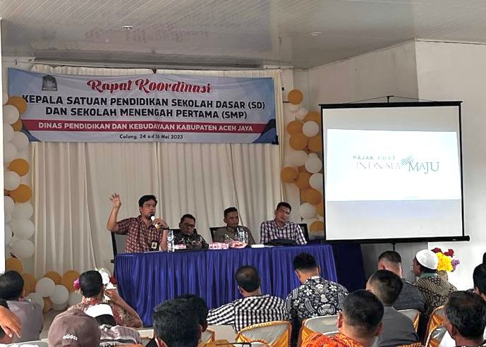 Kantor Pelayanan, Penyuluhan dan Konsultasi Perpajakan (KP2KP) Calang bersama Tim Penyuluh Kantor Pelayanan Pajak (KPP) Pratama Meulaboh memenuhi undangan Kepala Dinas Pendidikan dan Kebudayaan Aceh Jaya untuk menyampaikan materi terkait perpajakan atas Dana Bantuan Operasional Sekolah (BOS) dalam Rapat Koordinasi Kepala Sekolah Satuan Pendidikan SD dan SMP di Aula SMP Unggul Calang (Jumat, 26/5).