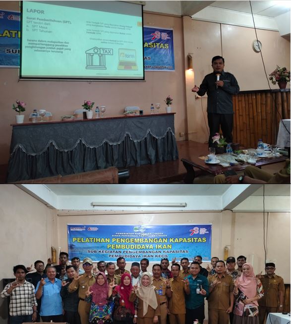 Kantor Pelayanan, Penyuluhan dan Konsultasi Perpajakan (KP2KP) Dabo Singkep, bekerja sama dengan Dinas Perikanan Kabupaten Lingga, mengadakan edukasi perpajakan bagi para kelompok nelayan Kabupaten Lingga di Hotel Sakura, Dabo Singkep, Kabupaten Lingga, Kepulauan Riau, Riau (Selasa, 22/8). Kegiatan edukasi ini merupakan bagian dari pelatihan pengembangan kapasitas pembudidaya ikan kepada para kelompok nelayan budidaya ikan, baik tambak udang, lele, maupun ikan lainnya.