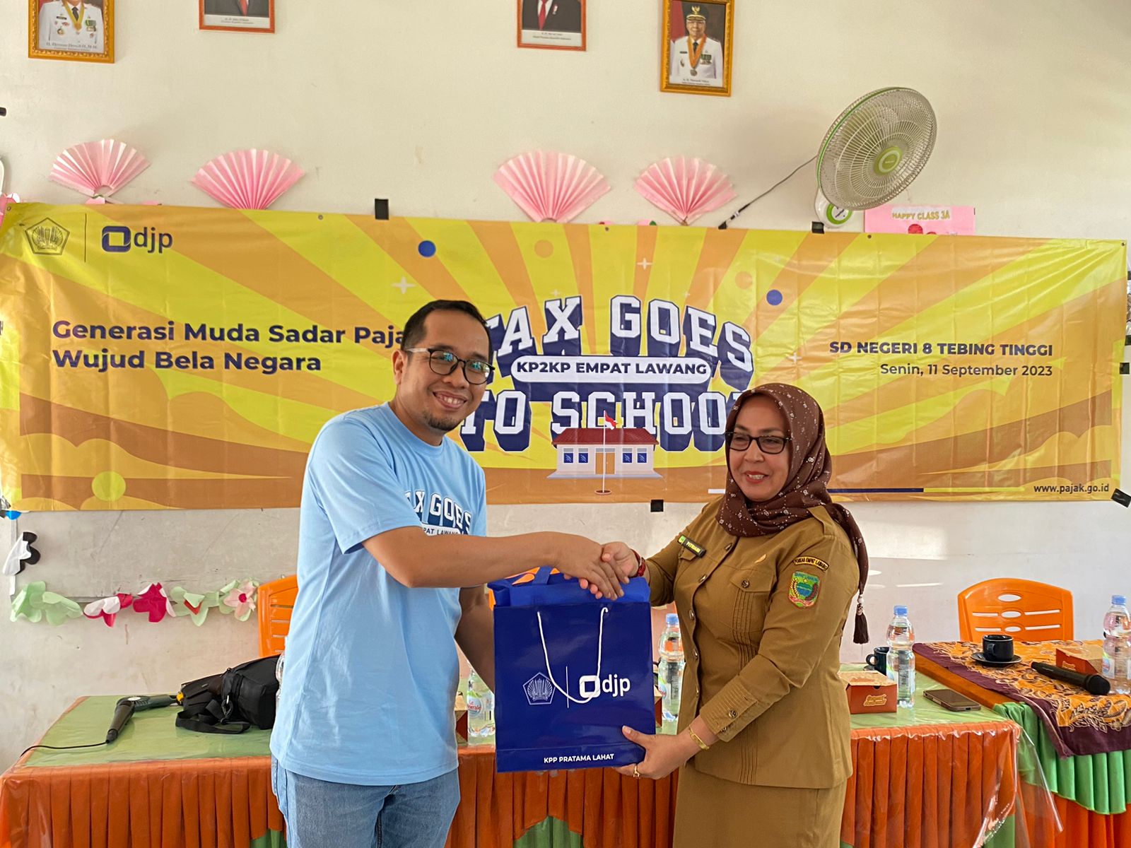 Kantor Pelayanan, Penyuluhan, dan Konsultasi Perpajakan (KP2KP) Empat Lawang semarakan Tax Goes To School (TGTS) bersama siswa-siswi SD Negeri 8 Tebing Tinggi, Empat Lawang, Sumatera Selatan (Senin, 11/9). TGTS kali ini bertemakan "Sadar Pajak, Bukti Peduli Pada Negeri" dan diikuti oleh tiga puluhsiswa kelas 6.