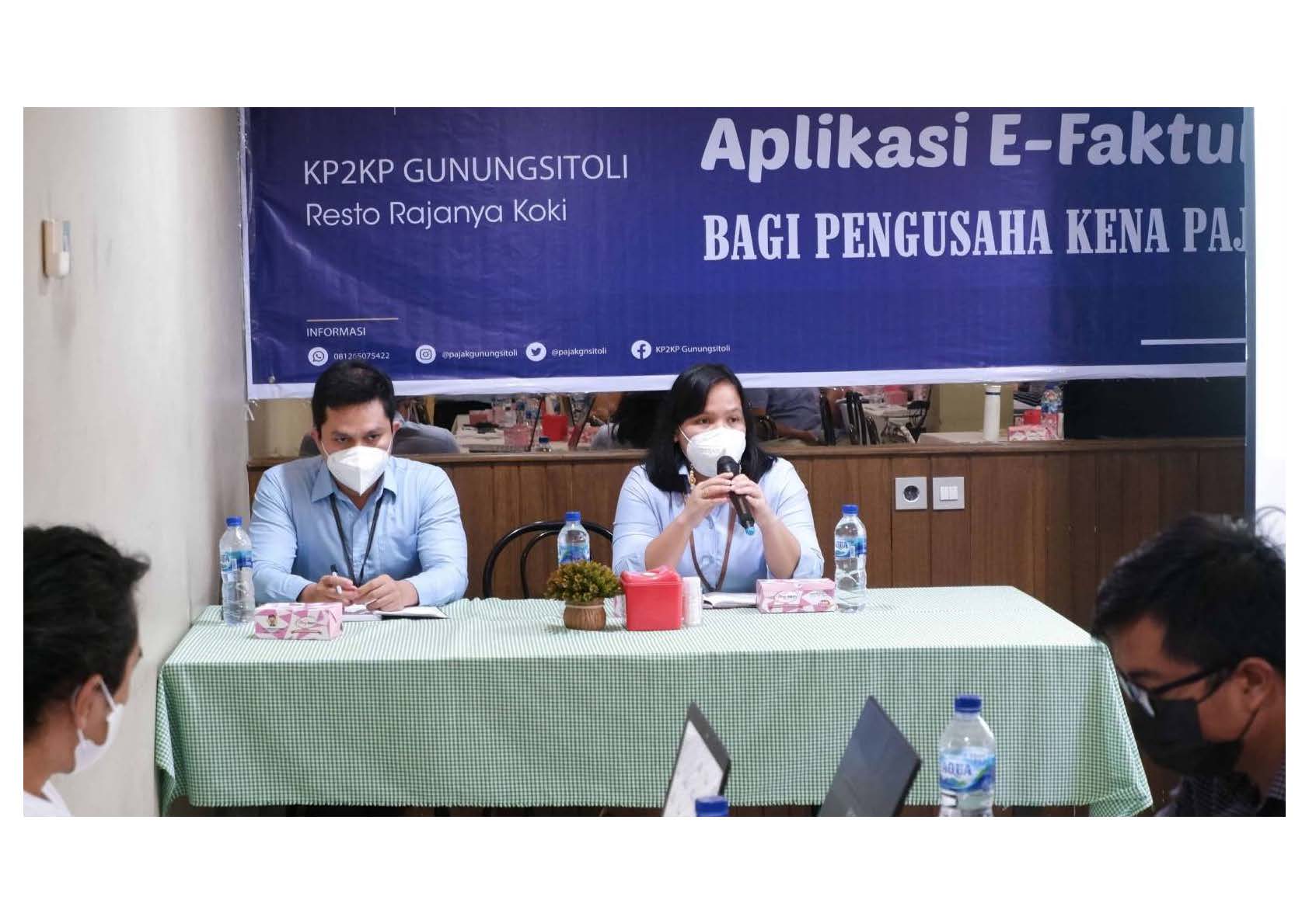 Kantor Pelayanan, Penyuluhan, dan Konsultasi Perpajakan (KP2KP) Gunungsitoli bersama Fungsional Penyuluh Kantor Pelayanan Pajak (KPP) Pratama Sibolga mengadakan edukasi Kewajiban Perpajakan dan Penggunaan Aplikasi e-Faktur bagi Pengusaha Kena Pajak (PKP) di Resto Rajanya Koki, Kota Gunungsitoli, Sumatera Utara (Rabu, 6/10).