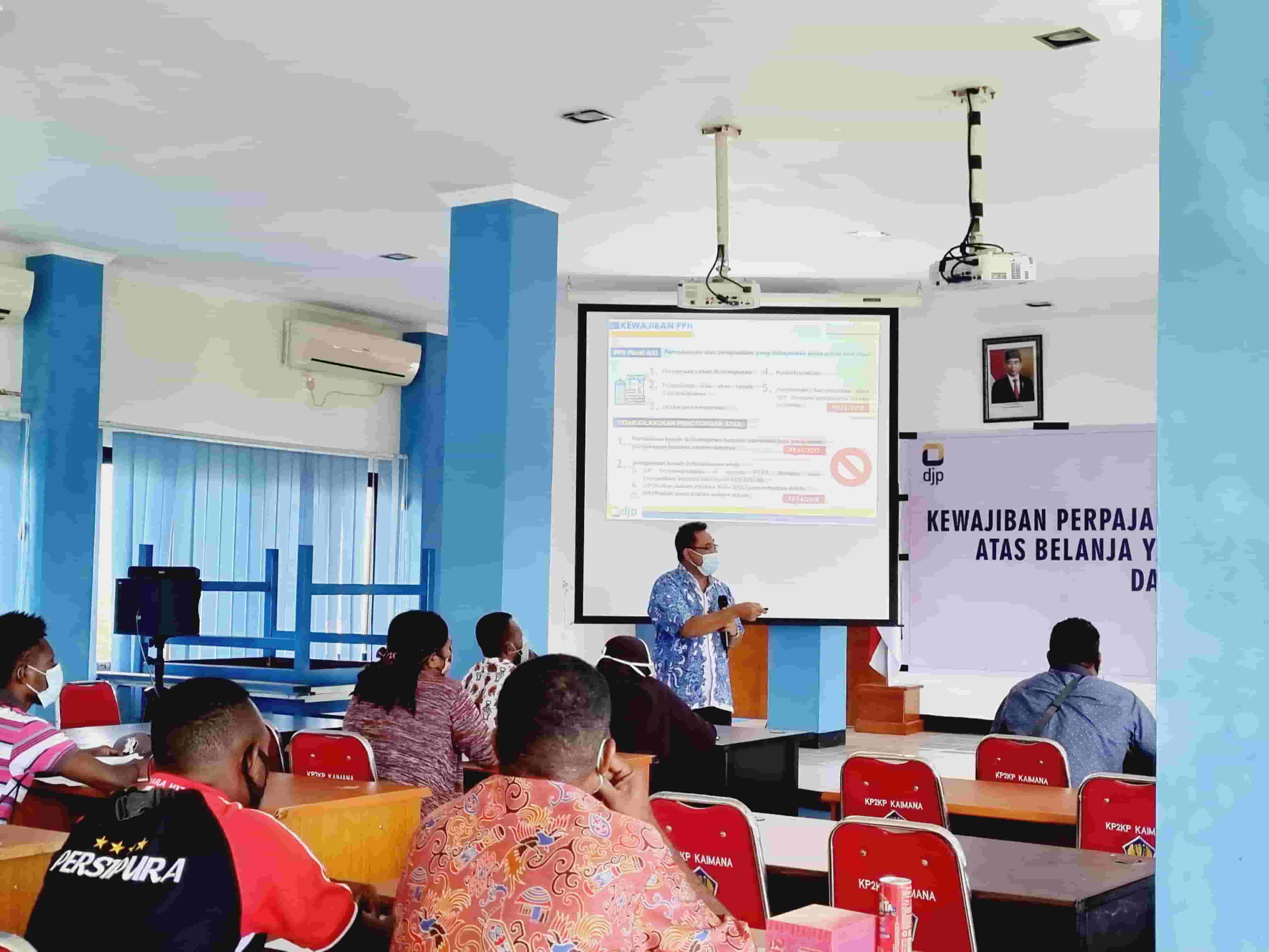 Kantor Pelayanan, Penyuluhan dan Konsultasi Perpajakan (KP2KP) Kaimana menyelenggarakan Sosialisasi Kewajiban Perpajakan Bendahara Kampung atas Belanja yang Bersumber dari Dana Kampung dan Alokasi Dana Kampung di Aula KP2KP Kaimana, Kaimana, Papua Barat (Rabu, 27/8).