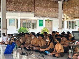 Ni Kadek Juniasih dan Ni Made Nita Wati menjelasakan kepada siswa-siswa Sekolah Tiara Nirwana bahwa, sebagai seorang pelajar dapat ikut serta untuk menerapkan wujud bela negara dengan belajar dengan giat serta menaati peraturan perundang-undangan di Indonesia dengan baik.