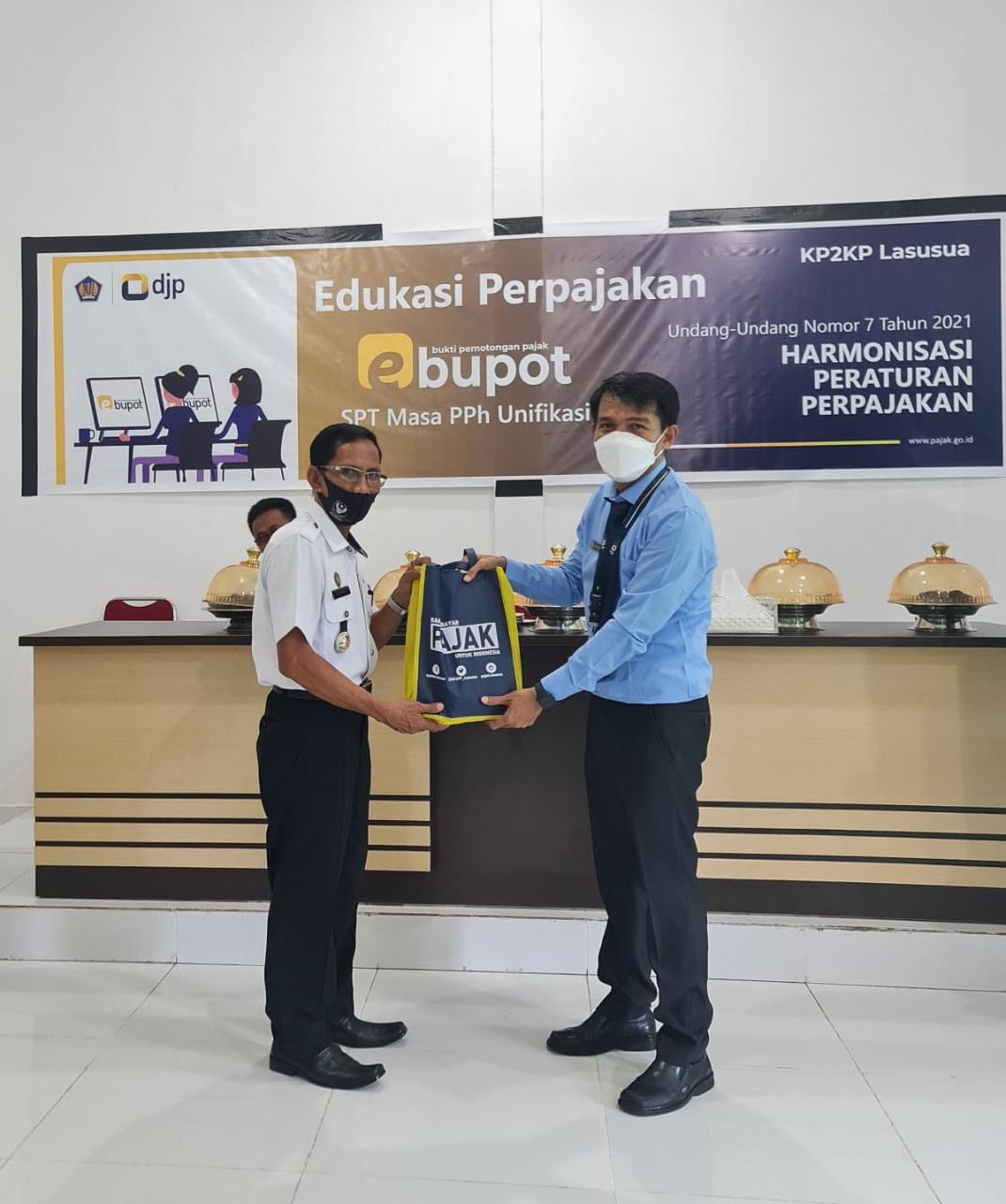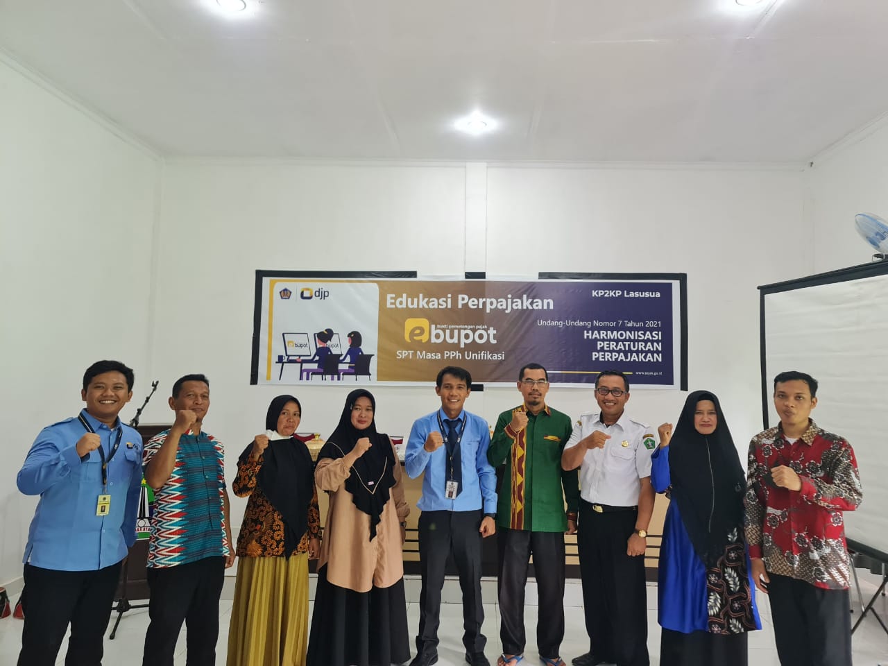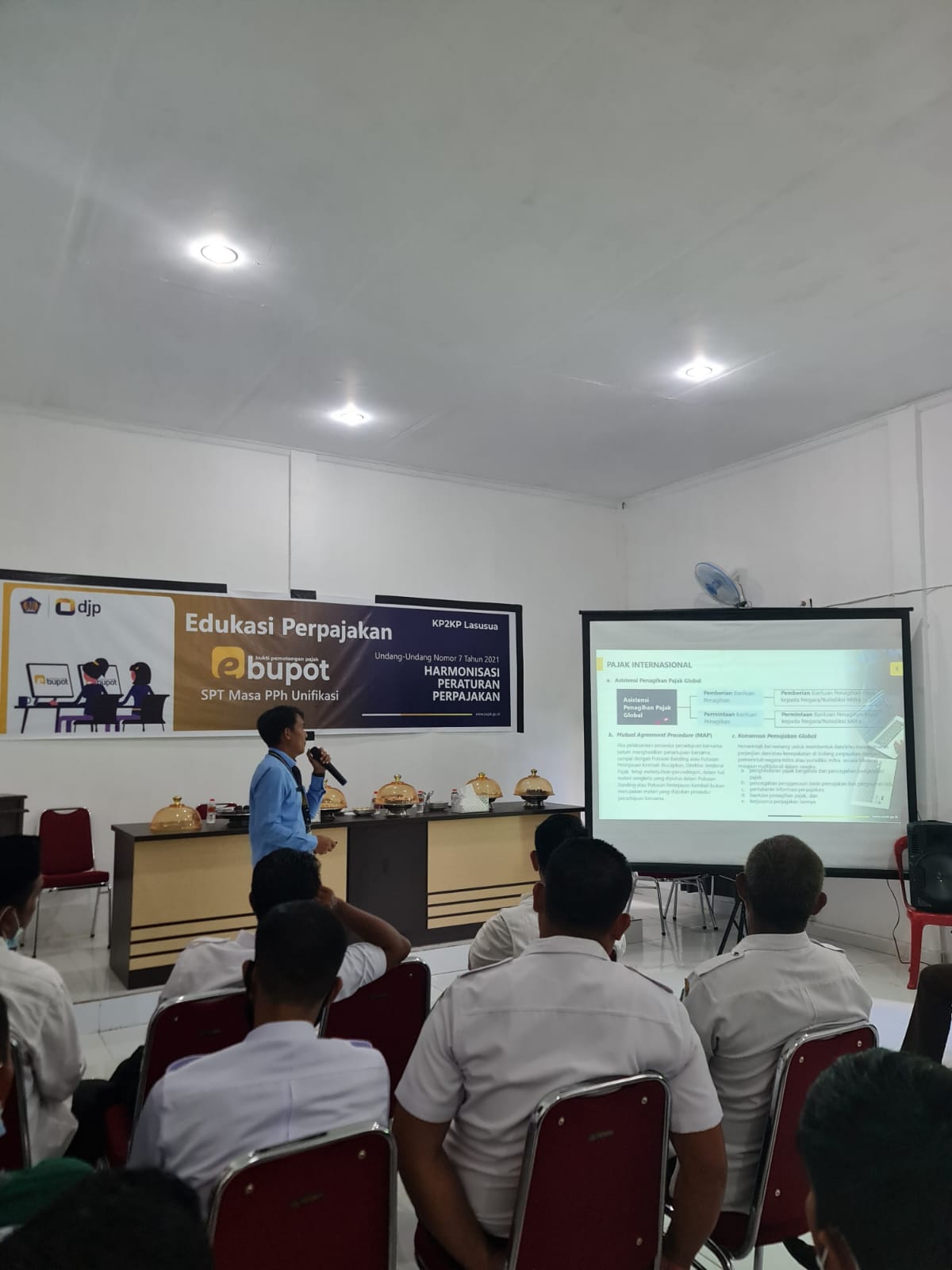 Kantor Pelayanan, Penyuluhan, dan Konsultasi Perpajakan (KP2KP) Lasusua melaksanakan kegiatan edukasi perpajakan terkait Undang-undang nomor 7 Tahun 2021 tentang Harmonisasi Peraturan Perpajakan (Selasa, 30/11). Kegiatan ini dilangsungkan di ruang aula Kantor Urusan Agama (KUA) Kecamatan Katoi, Kabupaten Kolaka Utara.