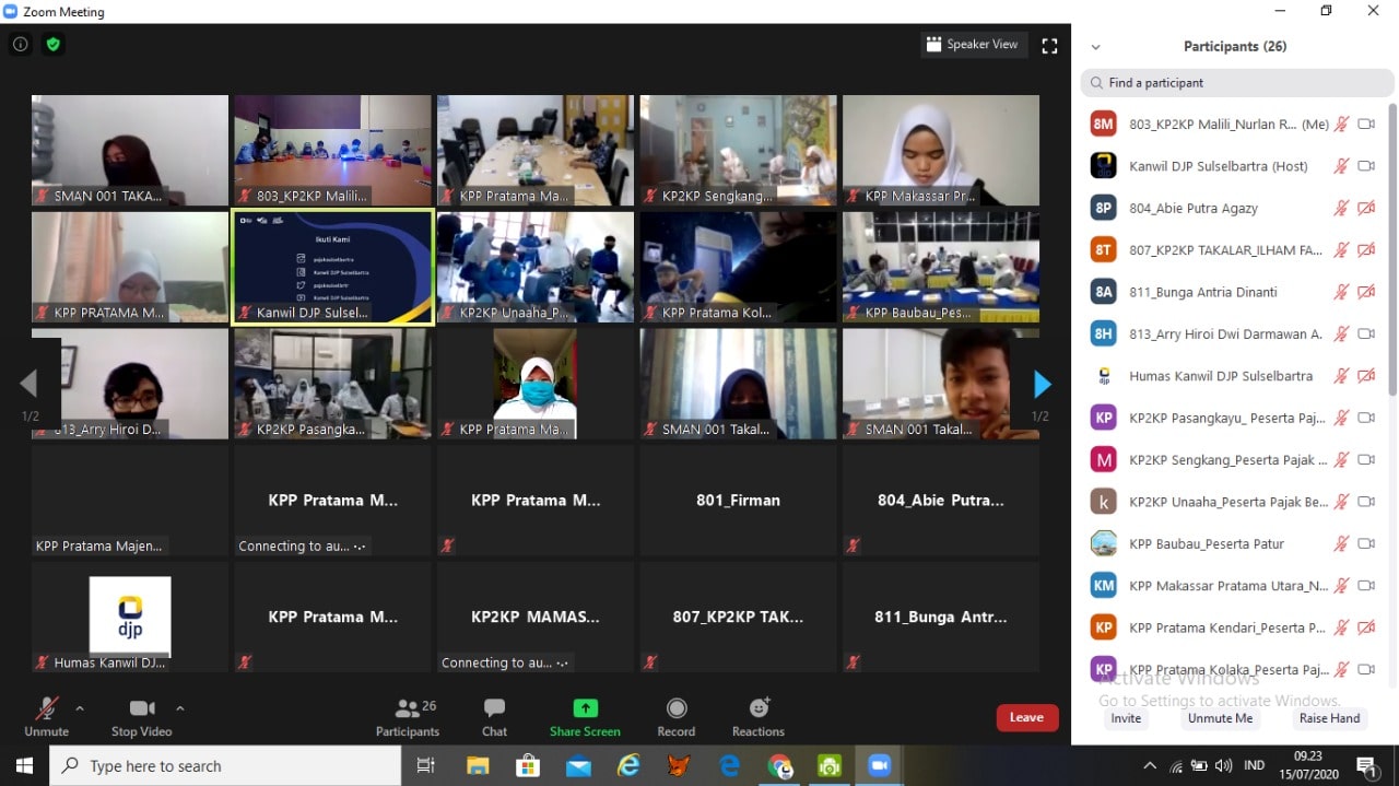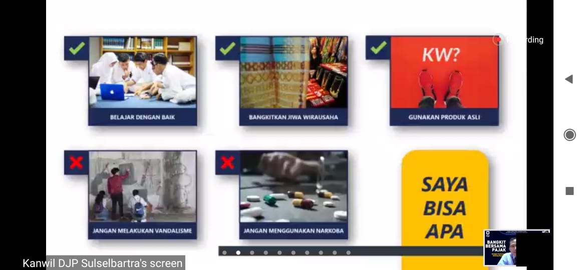 Kantor Pelayanan, Penyuluhan, dan Konsultasi Perpajakan (KP2KP) Malili bersama Kantor Wilayah DJP Sulawesi Selatan, Barat, dan Tenggara (Kanwil DJP Sulselbartra) menyelenggarakan kegiatan Pajak Bertutur 2020 secara webinar di Malili dan Manado (Rabu, 15/7). Peserta kegiatan dari KP2KP Malili meliputi 10 siswa dan siswi Sekolah Menengah Atas (SMA) Negeri 1 Luwu Timur. Kegiatan Pajak Bertutur ini merupakan kegiatan sosialisasi perpajakan yang bertujuan untuk memperkenalkan serta menumbuhkan kesadaran pajak pada generasi muda yang berada dalam usia sekolah.