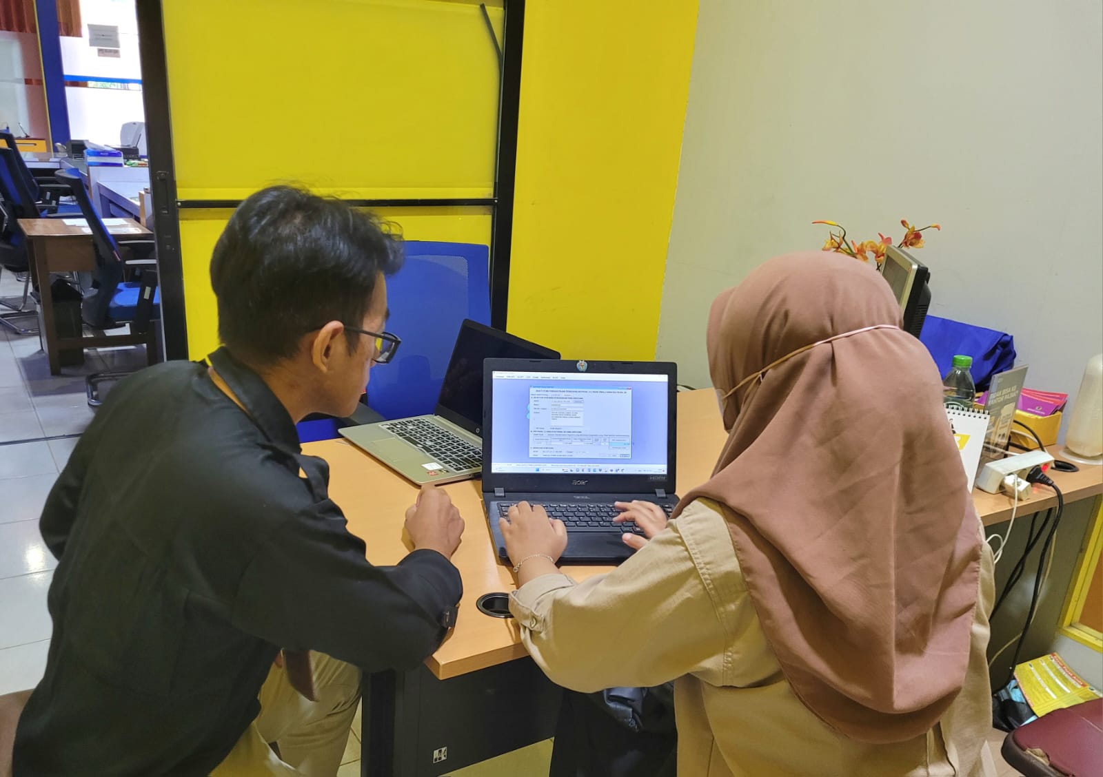 Saat sesi konsultasi, petugas membantu wajib pajak untuk memasang aplikasi e-SPT 21 ke dalam laptop wajib pajak. Aplikasi e-SPT 21 sendiri merupakan salah satu aplikasi pajak yang dapat digunakan untuk merekam bukti pemotongan pajak dari gaji yang diberikan kepada karyawan atau pegawai. “Kami baru mau mulai melakukan pemotongan pajak Bang,” jelas Rahayu saat berdiskusi dengan petugas. Rahayu menjelaskan bahwa organisasi SUAR saat ini sudah mendapatkan lebih banyak donatur sehingga perlu melakukan pemotongan pajak.