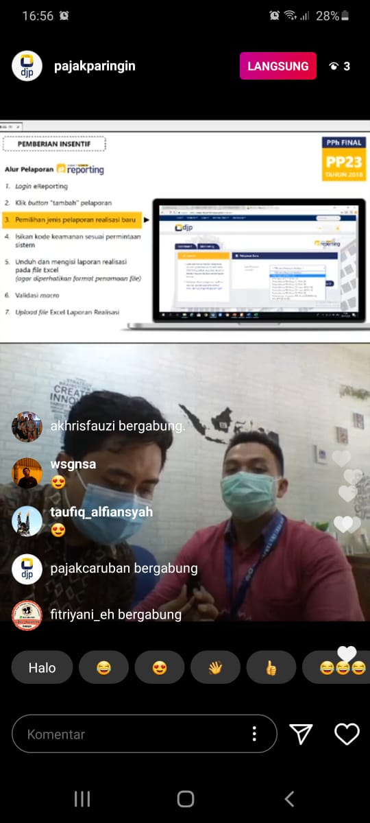KP2KP Paringin melakukan sosialisasi Peraturan Menteri Keuangan nomor PMK-86/PMK.03/2020 tentang Insentif Pajak untuk Wajib Pajak Terdampak Pandemi Covid-19 melalui live Instagram di Kabupaten Balangan, Kalimantan Selatan (Selasa, 28/7). Materi sosialisasi kali ini difokuskan untuk jenis insentif yang diberikan kepada Wajib Pajak UMKM yang memiliki kewajiban pajak PP 23 Tahun 2008 atau wajib pajak yang melakukan pembayaran pajak penghasilan final pasal 4 ayat (2) sebesar 0,5% dari omzetnya.