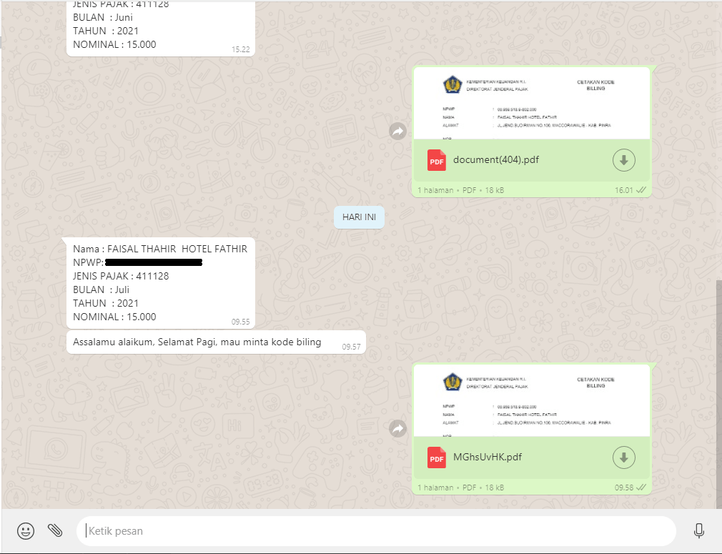“Dulu sebelum pandemi banyak yang datang ke kantor untuk sekedar membuat billing yang sebenarnya bisa dibuat secara mandiri, dengan WA Billing ini Alhamdulillah semakin sedikit yang datang ke kantor dan beralih lewat WA,” ujar Ihya Ulumuddin salah satu petugas TPT KP2KP Pinrang.