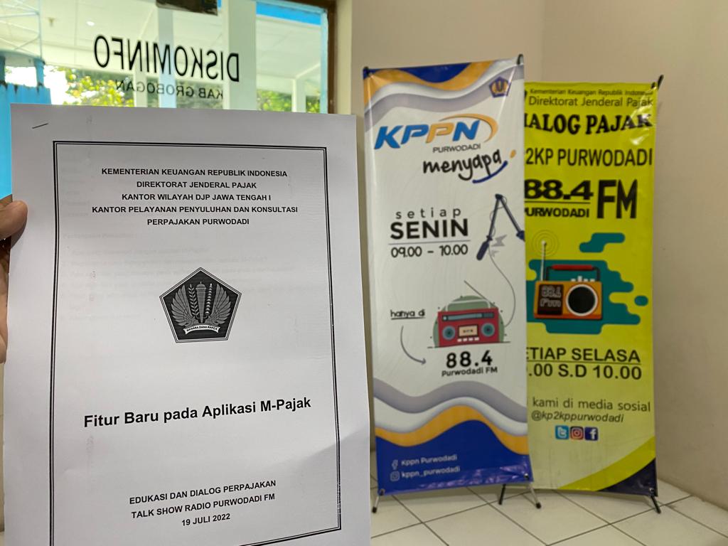 Kantor Pelayanan, Penyuluhan, dan Konsultasi Perpajakan (KP2KP) Purwodadi melaksanakan sosialisasi perpajakan melalui radio dengan tema "Fitur Baru pada Aplikasi M-Pajak" di Radio Purwodadi FM, Jl. D.I. Panjaitan No.47, Purwodadi, Grobogan (Selasa, 19/7).