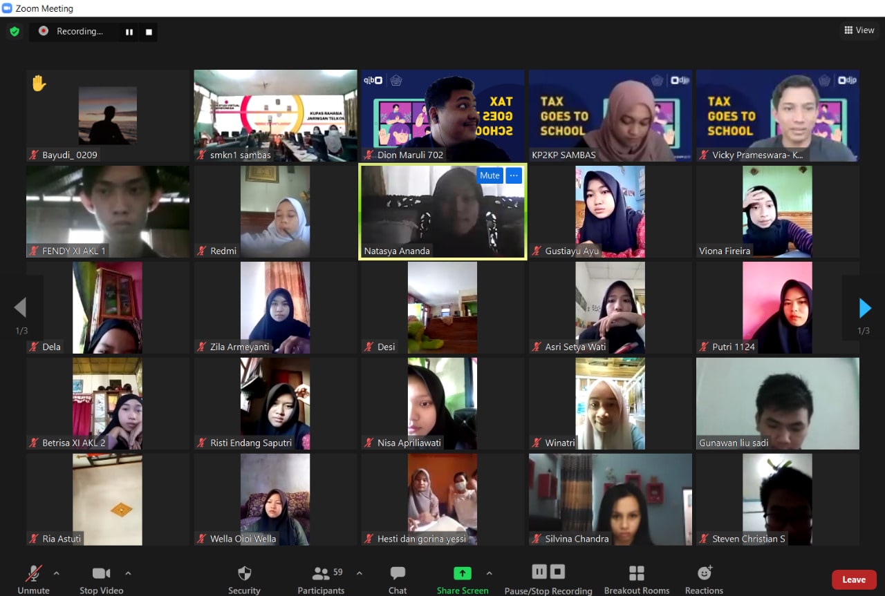 Kantor Pelayanan, Penyuluhan, dan Konsultasi Perpajakan (KP2KP) Sambas mengadakan kegiatan Tax Goes To School (TGTS) yang dihadiri oleh guru dan 90 siswa dari SMK Negeri 1 Sambas melalui aplikasi Zoom Meeting di Kabupaten Sambas (Kamis, 27/5). Tujuan kegiatan ini untuk mengenalkan pajak kepada generasi muda.