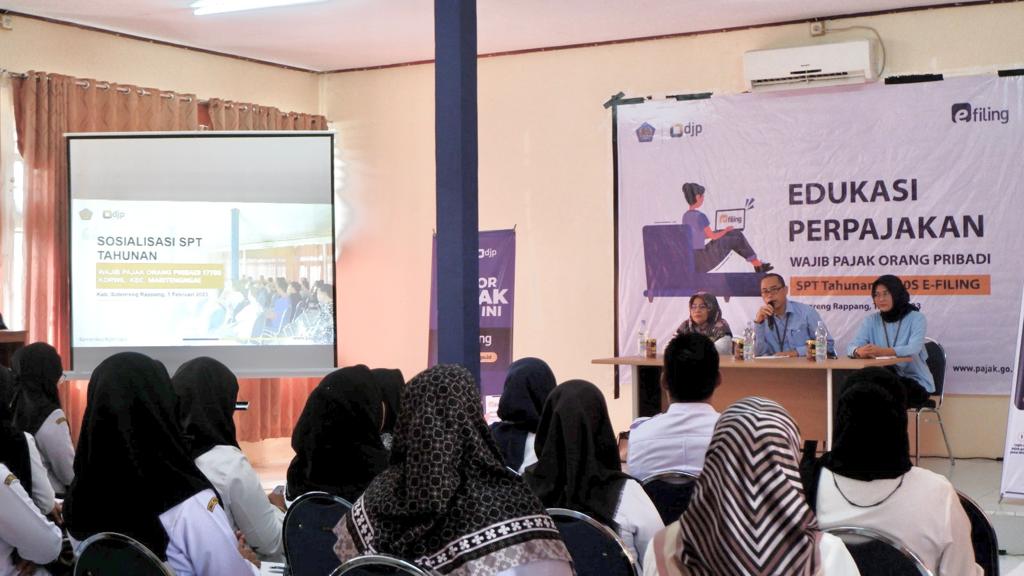 Kantor Pelayanan, Penyuluhan, dan Konsultasi Perpajakan (KP2KP) Sidrap menyelenggarakan bimbingan teknis cara pelaporan Surat Pemberitahuan (SPT) Tahunan menggunakan e-Filing kepada seluruh bendaharawan se-Kecamatan Maritengngae Kabupaten Sidrap di Aula KP2KP Sidrap (Rabu, 1/2). Sosialisasi dihadiri oleh 51 bendaharawan beserta Ketua Koordinator Wilayah (Korwil) Kecamatan Maritengngae, Sadariah, S.Pd.