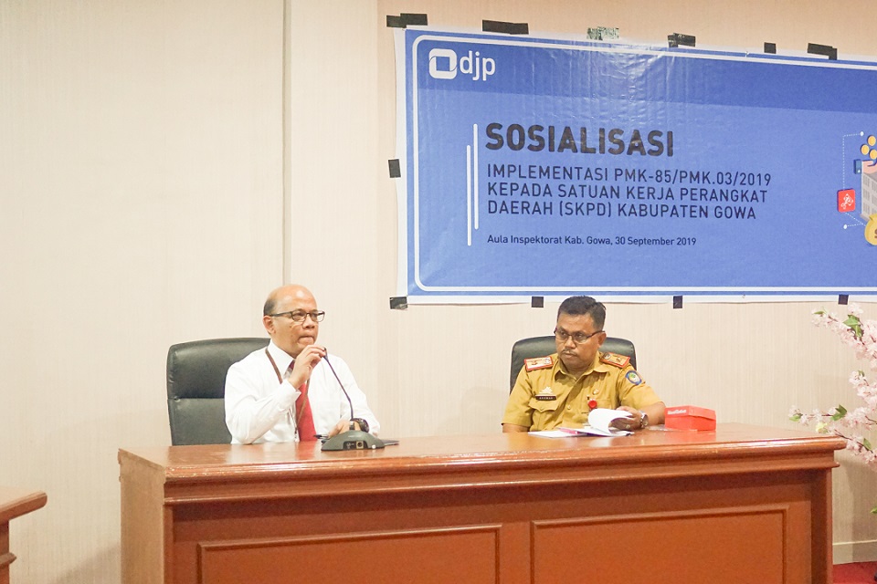 Kantor Pelayanan, Penyuluhan, Dan Konsultasi Perpajakan (KP2KP) Sungguminasa bersama Kantor Pelayanan Pajak (KPP) Pratama Bantaeng mengadakan Sosialisasi Peraturan Menteri Keuangan Nomor 85 tentang Mekanisme Pengawasan Terhadap Pemotongan/Pemungutan dan Penyetoran Pajak atas Belanja yang bersumber dari APBD (Senin, 30/9). Kegiatan ini dilangsungkan di Ruang Rapat BPKD Kabupaten Gowa.