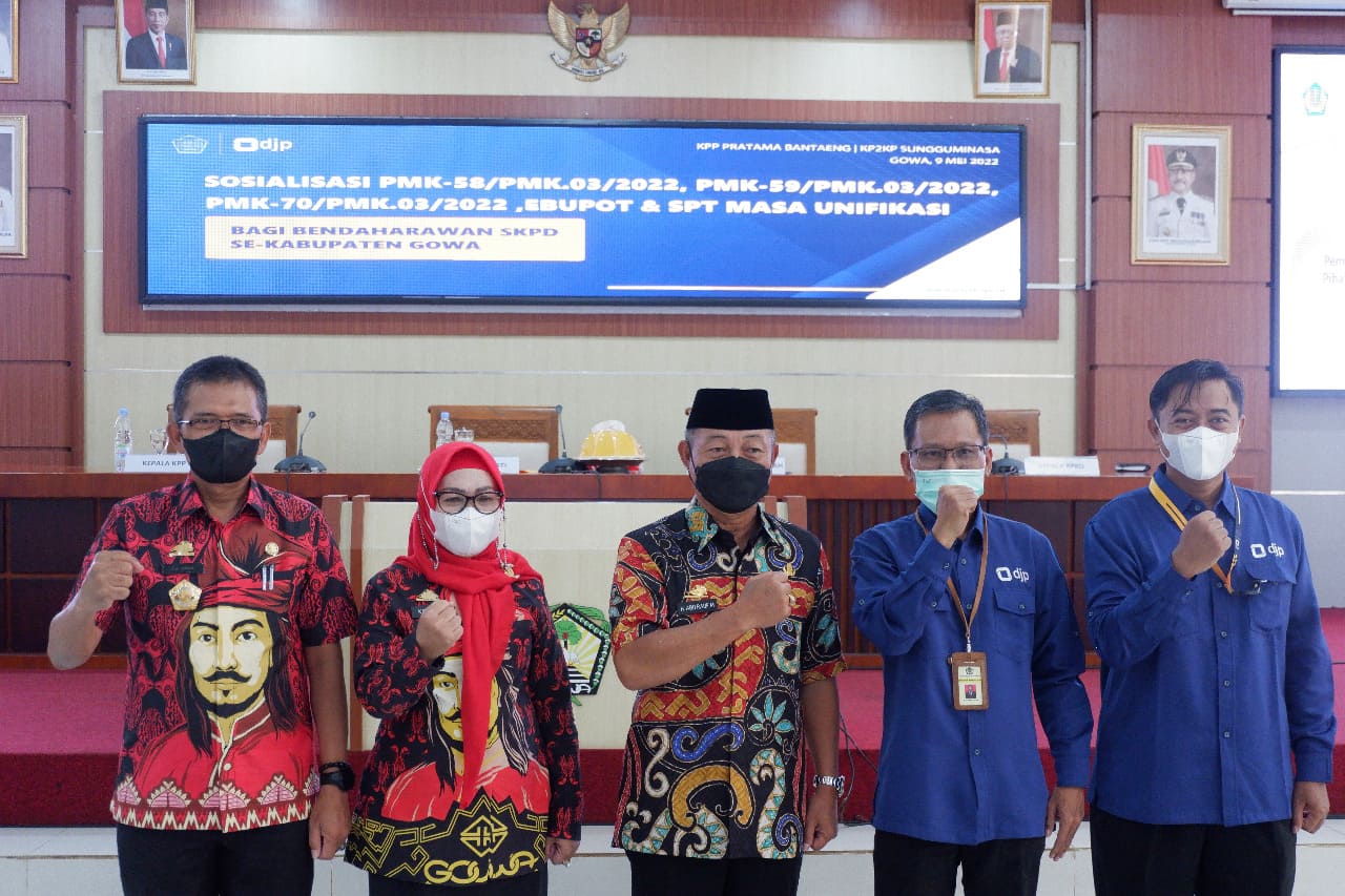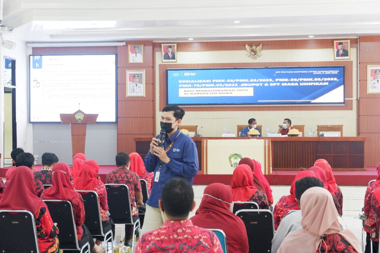 Kantor Pelayanan, Penyuluhan, dan Konsultasi Perpajakan (KP2KP) Sungguminasa bersama Kantor Pelayanan Pajak (KPP) Pratama Bantaeng menyelenggarakan kegiatan Sosialisasi PMK-58/PMK.03/2022, PMK-59/PMK.03/2022, PMK-70/PMK.03/2022, e-Bupot dan SPT Unifikasi bagi Bendahara Satuan Kerja Perangkat Daerah (SKPD) Se-Kabupaten Gowa (Kamis, 9/6). Kegiatan ini digelar secara tatap muka di Baruga Karaeng Galesong, Kantor Bupati Kabupaten Gowa.