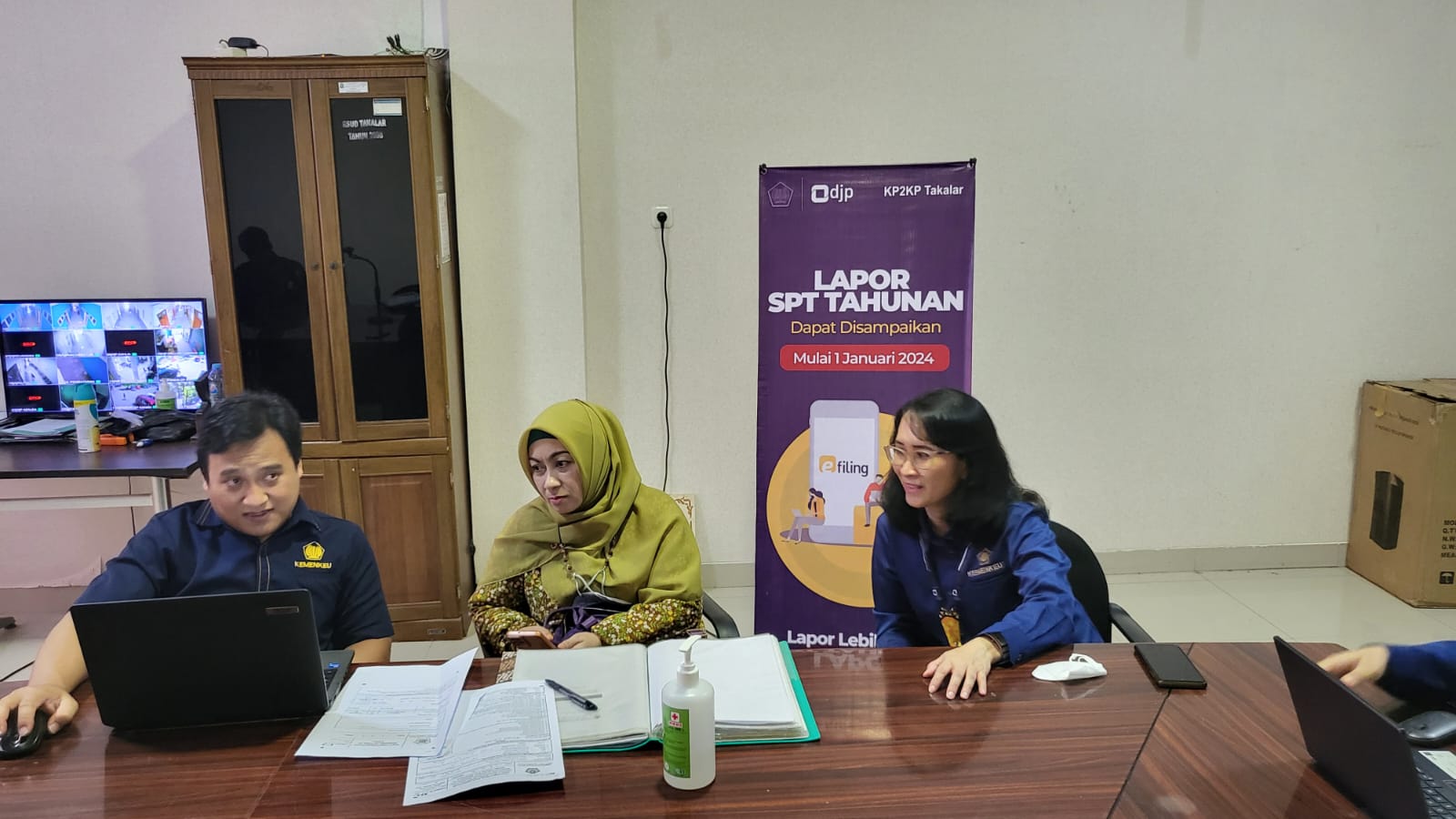 Kepala KP2KP Takalar Creschenthum Srimariastuti Boroh bersama Asisten Penyuluh Pajak Mahir KPP Pratama Bantaeng Tulus Dwi Atmanto dan Pelaksana KP2KP Takalar Fika Aulia Restiana memberikan asistensi pelaporan SPT Tahunan kepada para dokter menggunakan e-Form. Para Dokter Spesialis membawa bukti potong 1721-A2, daftar rekapitulasi penghasilan bruto dari kegiatan praktik mandiri dan beberapa bukti pemotongan PPh Pasal 21 (tidak final) dari rumah sakit yang berbeda untuk dilaporkan pada SPT Tahunan Orang Pribadi.