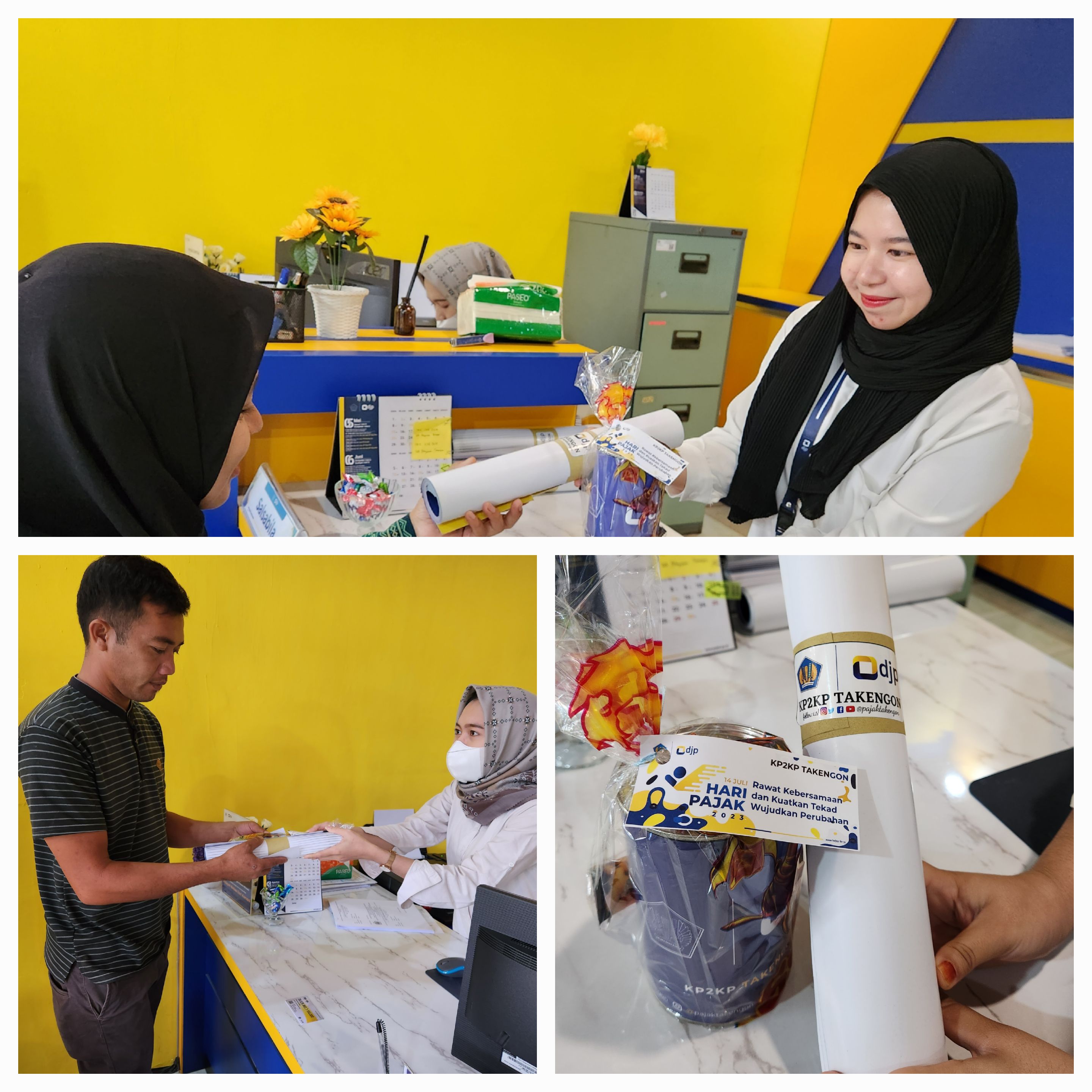 Kantor Pelayanan, Penyuluhan, dan Konsultasi Perpajakan (KP2KP) Takengon memberikan apresiasi kepada Wajib Pajak yang datang ke KP2KP Takengon (Jumat, 14/7). Hari Pajak tahun 2023 diperingati pada hari Jumat tanggal 14 Juli 2023 dengan mengusung tema " Rawat Kebersamaan dan Kuatkan Tekad Wujudkan Perubahan".