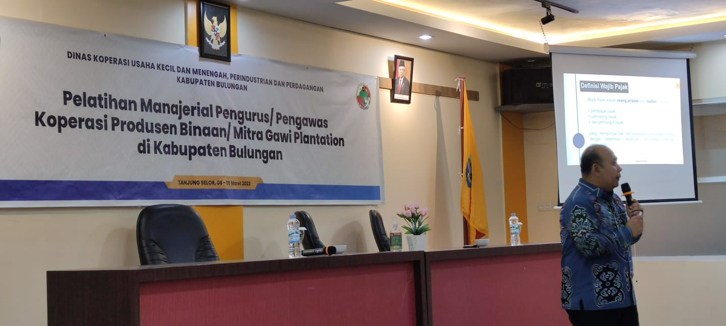 Kantor Pelayanan, Penyuluhan, dan Konsultasi Perpajakan (KP2KP) Tanjung Selor menjadi narasumber dalam acara "Pelatihan Manajerial Pengurus/Pengawas Koperasi Produsen /Mitra Gawi Plantation" yang diadakan Dinas Perindustrian, Perdagangan, Koperasi, Usaha Kecil dan Menengah (Disperindagkop-UKM) Kabupaten Bulungan bertempat di di Aula Disperindagkop-UKM Kabupaten Bulungan, Tanjung Selor, Kabupaten Bulungan (Selasa, 21/3).