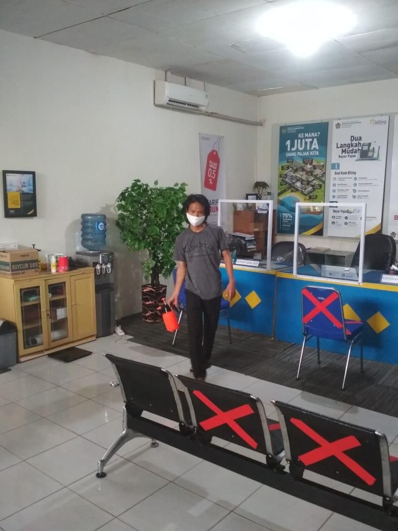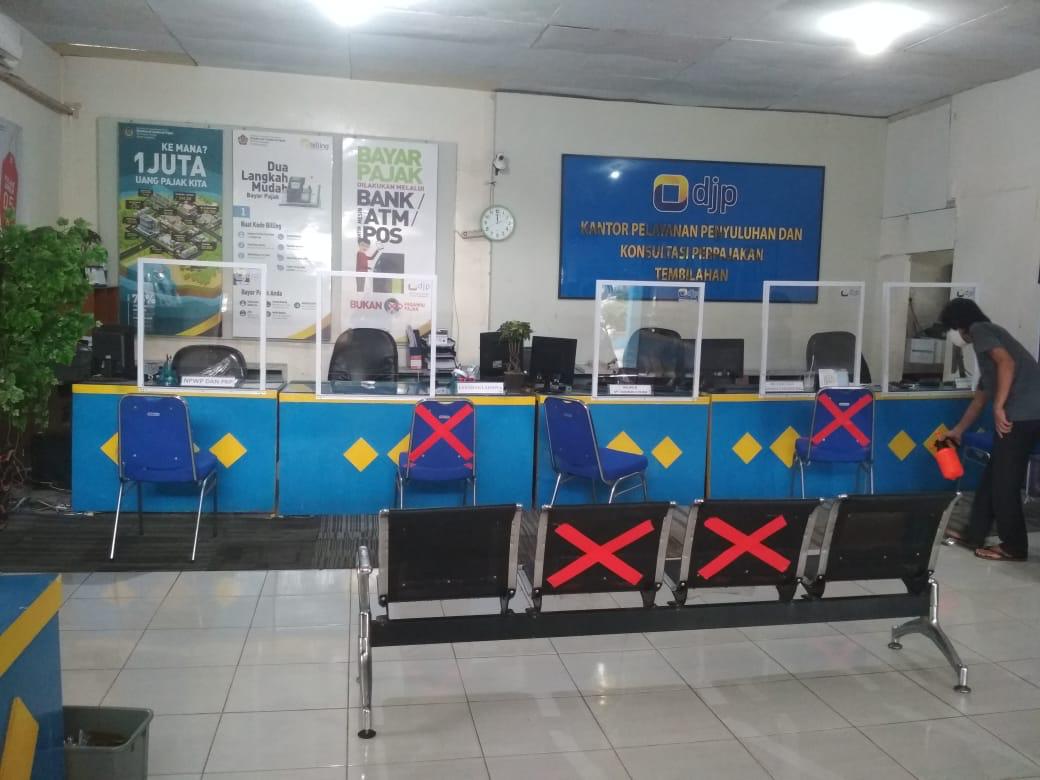 Pegawai KP2KP Tembilahan bersinergi dalam mempersiapkan beberapa hal seperti menambahkan sekat pembatas di meja tempat pelayanan terpadu, memberikan jarak antara wajib pajak yang menunggu antrean, menyediakan tempat cuci tangan, dan penyemprotan cairan disinfektan.