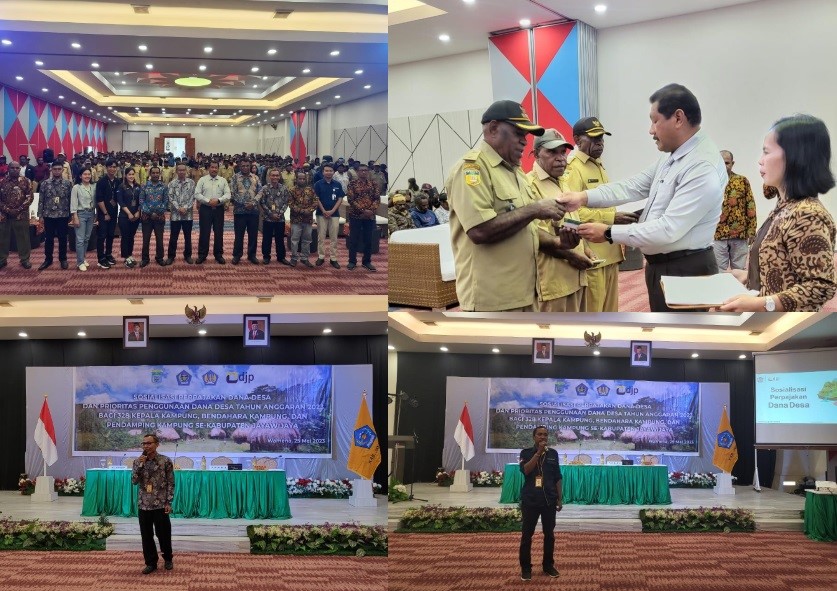 Kantor Pelayanan, Penyuluhan, dan Konsultasi Perpajakan (KP2KP) Wamena bekerja sama dengan Dinas Pemberdayaan Masyarakat Kampung (DPMK) Kabupaten Jayawijaya dalam menggelar kegiatan Sosialisasi Perpajakan Dana Desa di Aula Hotel Baliem Pilamo, Kabupaten Jayawijaya, Provinsi Papua Pegunungan (Kamis, 25/5). Kegiatan ini dihadiri oleh kepala kampung, bendahara kampung, dan pendamping kampung yang meliputi 328 kampung dan 40 distrik di wilayah Kabupaten Jayawijaya serta perwakilan dari BRI dan Kantor BPJS area Kabupaten Jayawijaya.