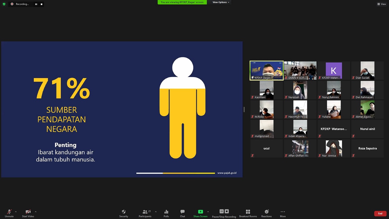 Kantor Pelayanan, Penyuluhan, dan Konsultasi Perpajakan (KP2KP) Watansoppeng melaksanakan progam Inklusi Kesadaran Pajak dalam pendidikan dengan menyelenggarakan kegiatan Pajak Bertutur (Rabu, 25/8). Acara yang diikuti 31 siswa perwakilan dari SMK Negeri 4 Soppeng ini dilangsungkan secara daring via aplikasi zoom meeting di ruang kelas pajak KP2KP Watansoppeng, Kabupaten Soppeng.