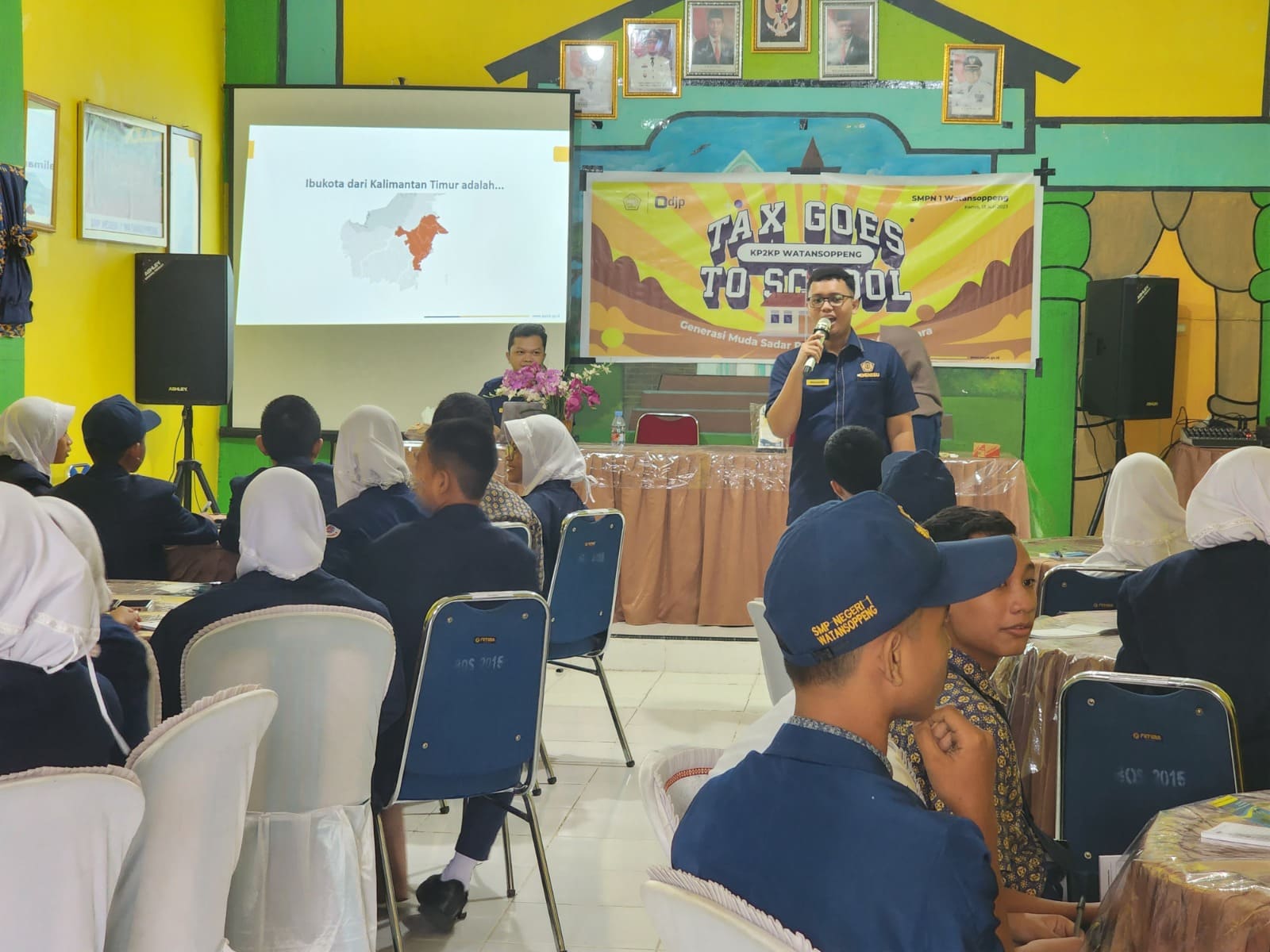 Kantor Pelayanan, Penyuluhan, dan Konsultasi Perpajakan (KP2KP) Watansoppeng menggelar Tax Goes To School (TGTS) pertamanya di SMPN 1 Watansoppeng. Program edukasi yang rutin dilakukan Direktorat Jenderal Pajak (DJP) ini dihadiri oleh seluruh anggota Organisasi Siswa Intra Sekolah (OSIS) (Kamis, 17/7).