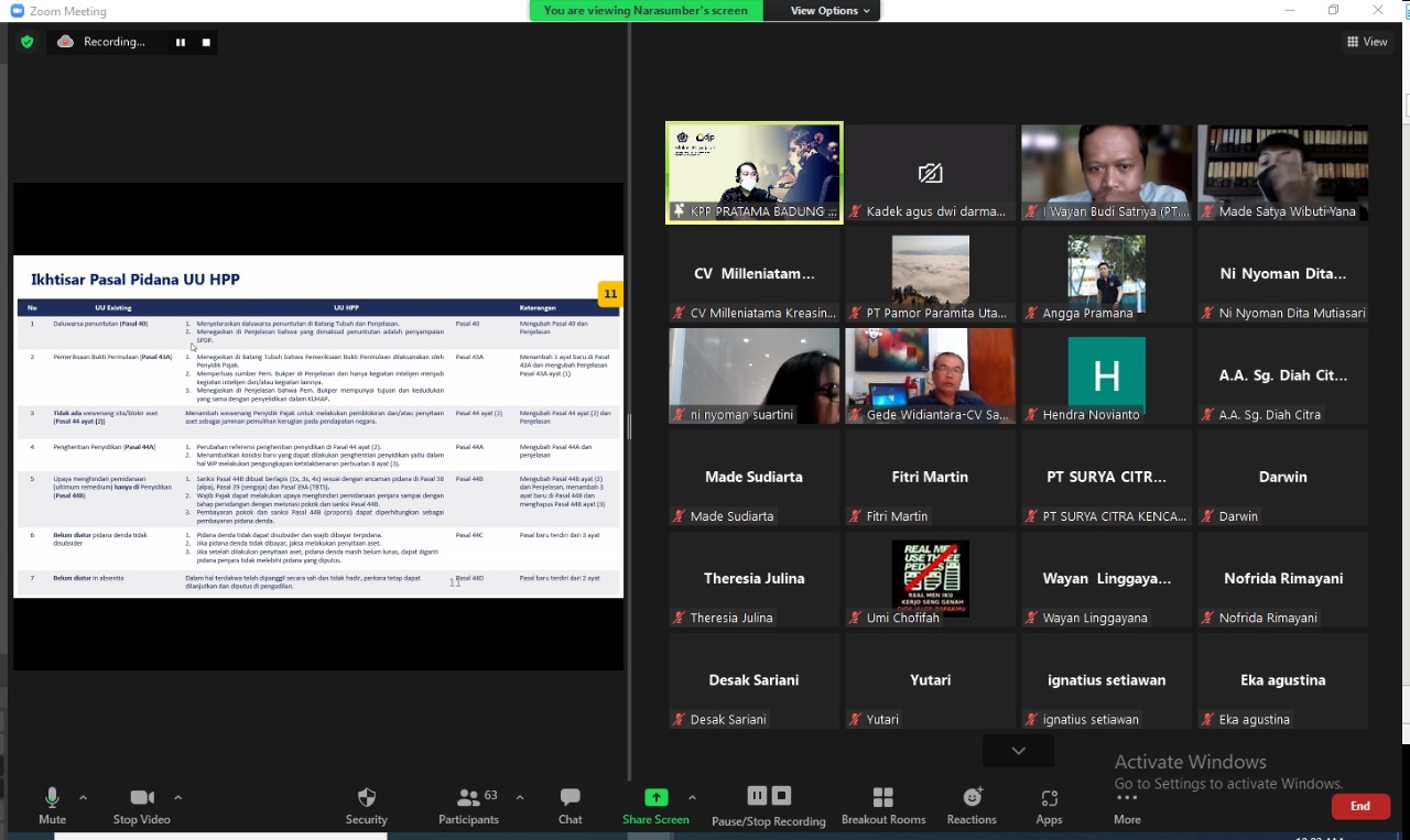 KPP Pratama Badung Selatan menggelar Kegiatan Edukasi Perpajakan tentang Undang-Undang Harmonisasi Peraturan Perpajakan (UU HPP) secara daring melalui aplikasi Zoom Cloud Meeting yang diikuti oleh para Pengusaha Kena Pajak (PKP) di Bali (Selasa, 23/11).