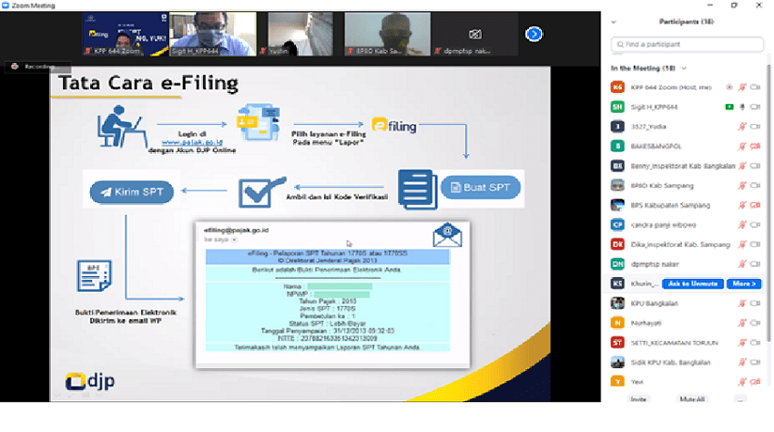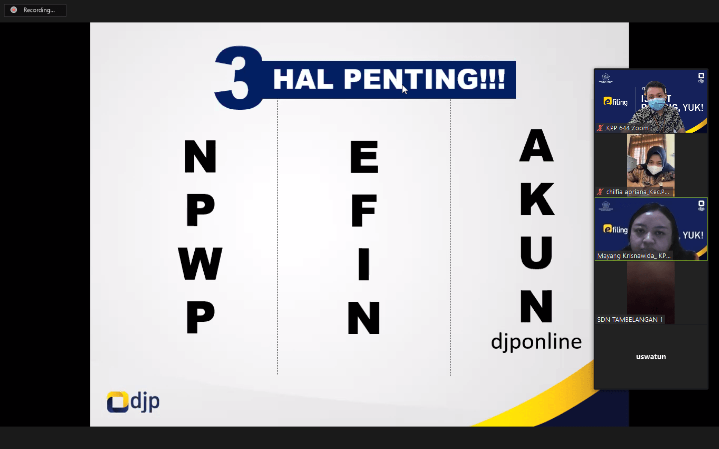 Pada setiap sesi telah ditugaskan pegawai dari KPP Pratama Bangkalan untuk menjadi host dan juga pemateri. Sebelumnya Wajib Pajak diarahkan untuk mendaftar melalui link googleform yang telah diberikan dan bebas untuk memilih sesi mana yang ingin diikuti.