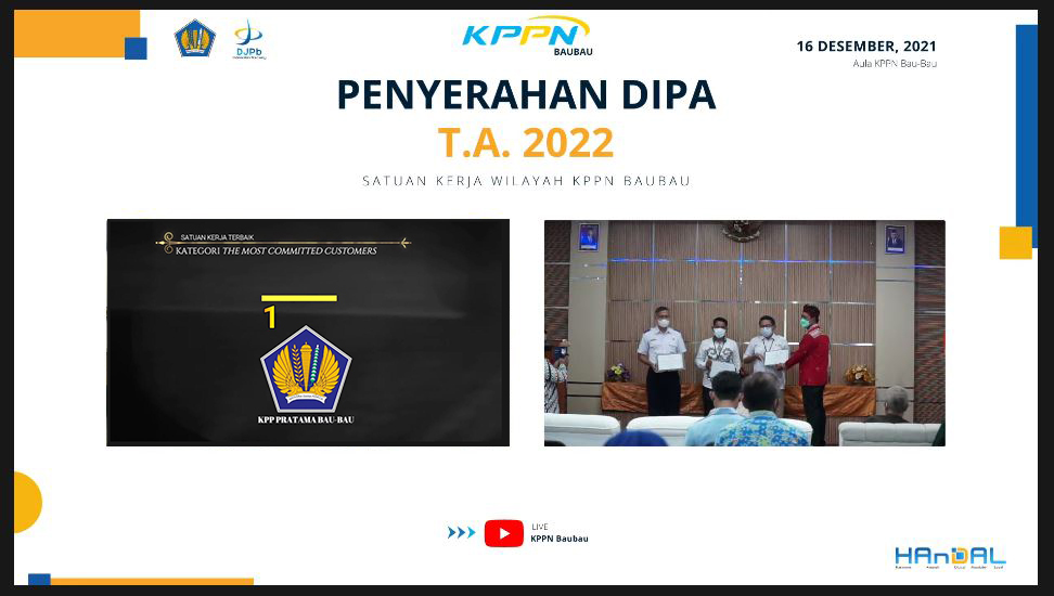 “Selama tahun 2021 ini kami sangat terkesan dengan komitmen seluruh satuan kerja di wilayah kerja kami dalam rangka pelaksanaan anggaran terkhusus satuan kerja KPP Pratama Baubau yang pada kesempatan kali ini kami berikan penghargaan The Most Committed Customers tahun 2021 sebagai bentuk apresiasi dari kami atas komitmen dari KPP Baubau selama ini. Sekedar informasi, ini merupakan pertama kalinya penghargaan dengan kategori The Most Committed Customers, oleh karena itu selamat kepada KPP Pratama Baubau semoga dapat menjadi teladan bagi satuan kerja lain di wilayah kerja kami,” tutur Hariyanto.
