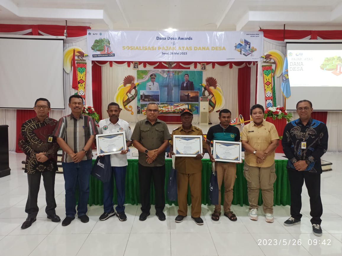 Kantor Pelayanan Pajak (KPP) Pratama Biak bersama Kantor Pelayanan, Penyuluhan, dan Konsultasi Perpajakan (KP2KP) Serui menyelenggarakan acara Dana Desa Awards dan Sosialisasi Pajak atas Dana Desa yang bertempat di Aula Gedung Silas Papare, Jl. Irian, Serui Kota, Yapen Selatan, Kabupaten Kepulauan Yapen, Papua (Jumat, 26/5). Kegiatan ini dihadiri oleh enam puluh undangan terdiri dari Para Kepala Kampung dan Tenaga Pendamping Kampung pada Distrik-Distrik di wilayah Kabupaten Kepulauan Yapen.