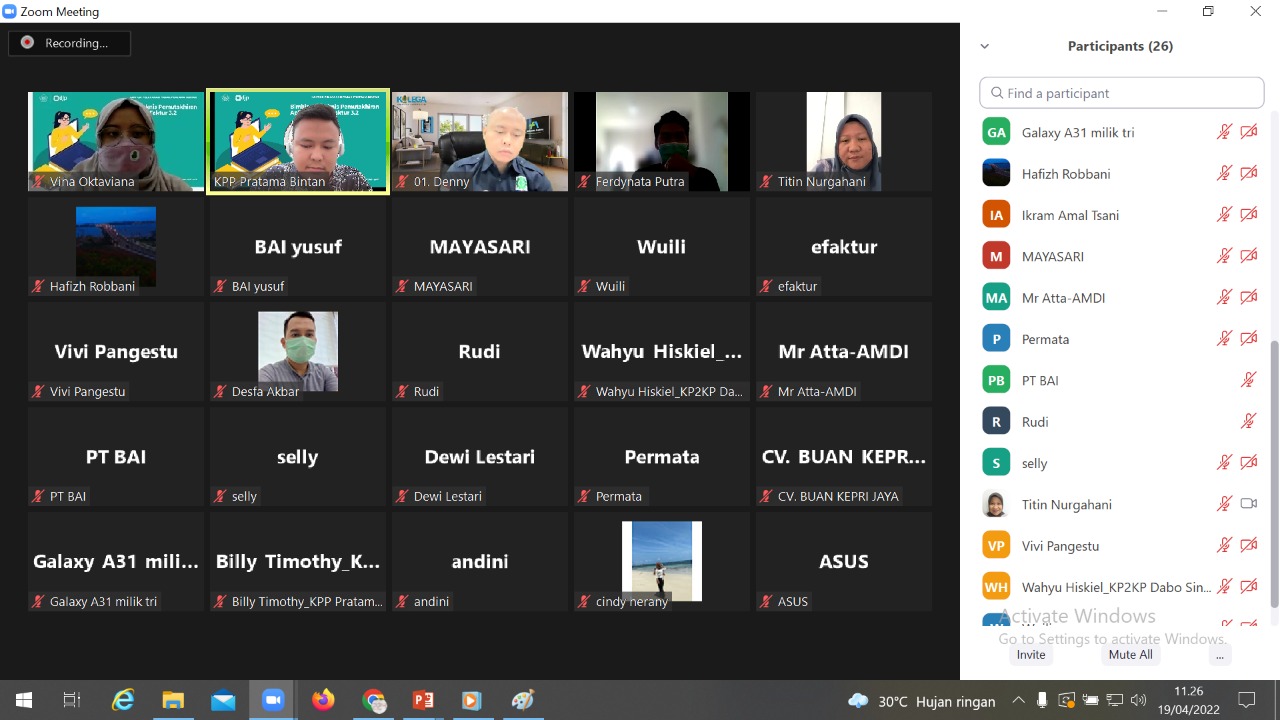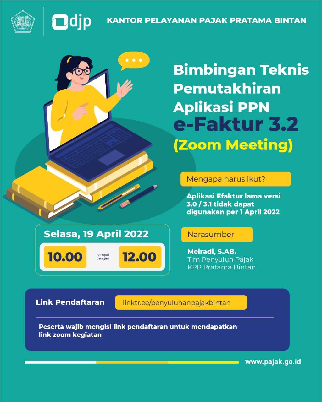 Kantor Pelayanan Pajak Pratama (KPP) Bintan kembali mengadakan bimbingan teknis (bimtek) secara daring dengan tema "Bimbingan Teknis Pemutakhiran Aplikasi ePPN e-Faktur 3.2" yang dibuka untuk umum di Bintan, Kepulauan Riau (Selasa, 19/4). Bimtek yang dilaksanakan mulai pukul 10.00 WIB ini dipandu oleh Petugas Penyuluh KPP Bintan Meiradi sebagai pemateri.