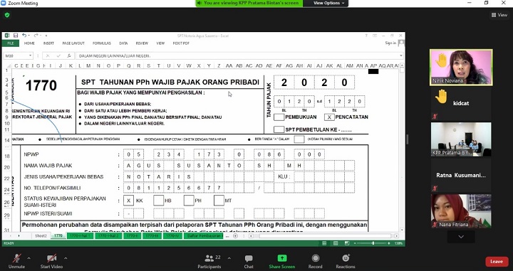 Kantor Pelayanan Pajak Pratama Bintan mengadakan sosialisasi secara daring melalui Zoom Cloud Meetings tentang kewajiban perpajakan untuk Notaris dan Pejabat Pembuat Akta Tanah (PPAT) di Bintan (Rabu, 24/2).