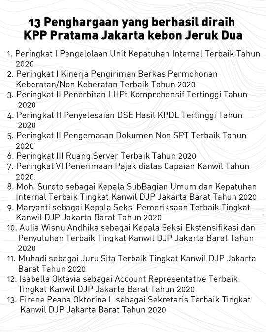 Kantor Pelayanan Pajak (KPP) Pratama Jakarta Kebon Jeruk Dua meraih 13 penghargaan di tingkat kanwil atas kinerjanya sepanjang tahun 2020.
