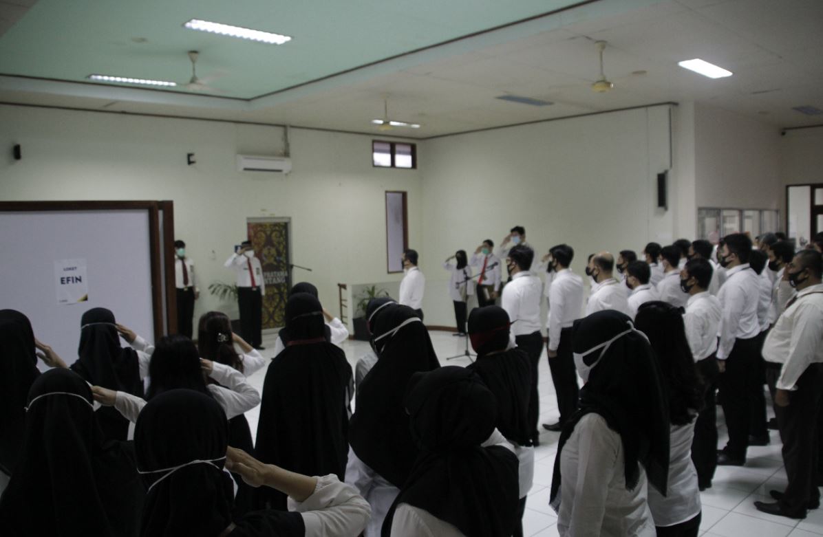 Dengan tetap memperhatikan protokol kesehatan pencegahan penyebaran Corona Virus Disease (Covid-19), seluruh peserta upacara wajib menggunakan masker.