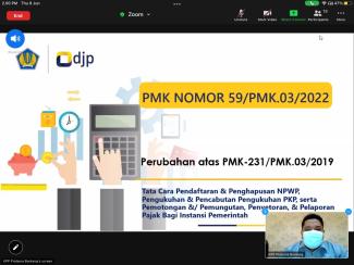 Kantor Pelayanan Pajak (KPP) Pratama Bontang menyelenggarakan Kelas Pajak dengan materi utama mengenai Peraturan Menteri Keuangan (PMK) Nomor 59 tahun 2022 tentang tata cara pendaftaran & penghapusan NPWP, pengukuhan PKP & pencabutan pengukuhan PKP, serta pemotongan &/ pemungutan, penyetoran & dan pelaporan pajak bagi instansi pemerintah (Kamis, 9/6). Kegiatan ini dilangsungkan secara daring dari ruang penyuluhan KPP Pratama Bontang, Kota Bontang.